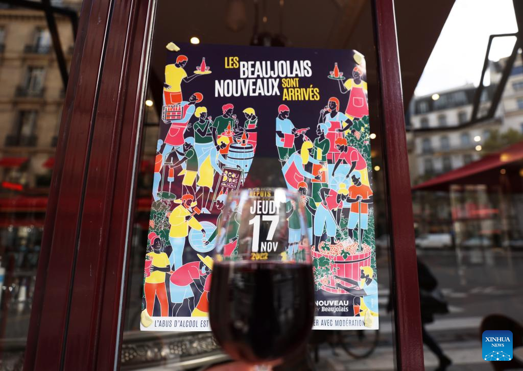 A poster of new Beaujolais Nouveau wine is seen outside a restaurant in Paris, France, Nov. 17, 2022. The new Beaujolais Nouveau, a well-known French wine, was released on Thursday. (Xinhua/Gao Jing)