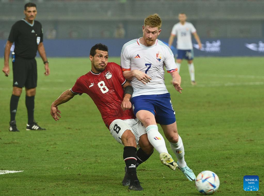 Kevin De Bruyne (R) of Belgium vies with Tarek Hamed of Egypt during an international friendly football match between Belgium and Egypt at Jaber Al-Ahmad International Stadium in Al Farwaniyah Governorate, Kuwait, on Nov. 18, 2022. (Photo by Asad/Xinhua)
