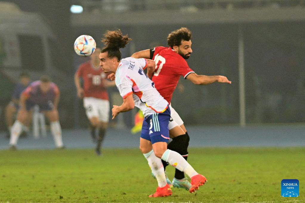 Belgium's Arthur Theate (L) vies with Egypt's Mohamed Salah during an international friendly football match between Belgium and Egypt at Jaber Al-Ahmad International Stadium in Al Farwaniyah Governorate, Kuwait, on Nov. 18, 2022. (Photo by Asad/Xinhua)