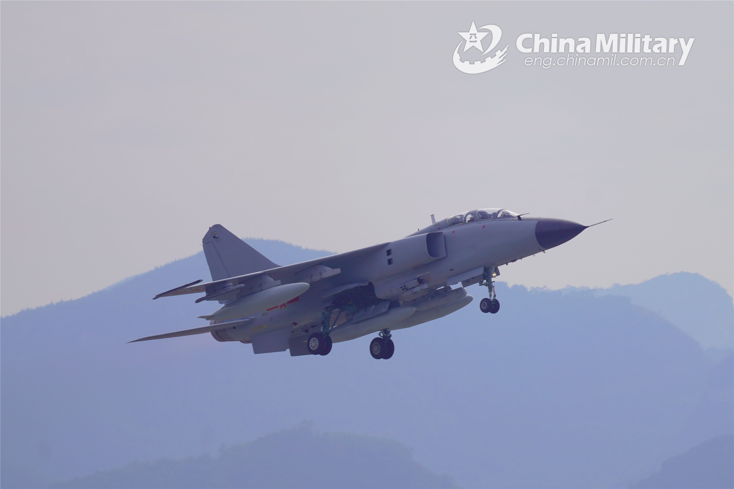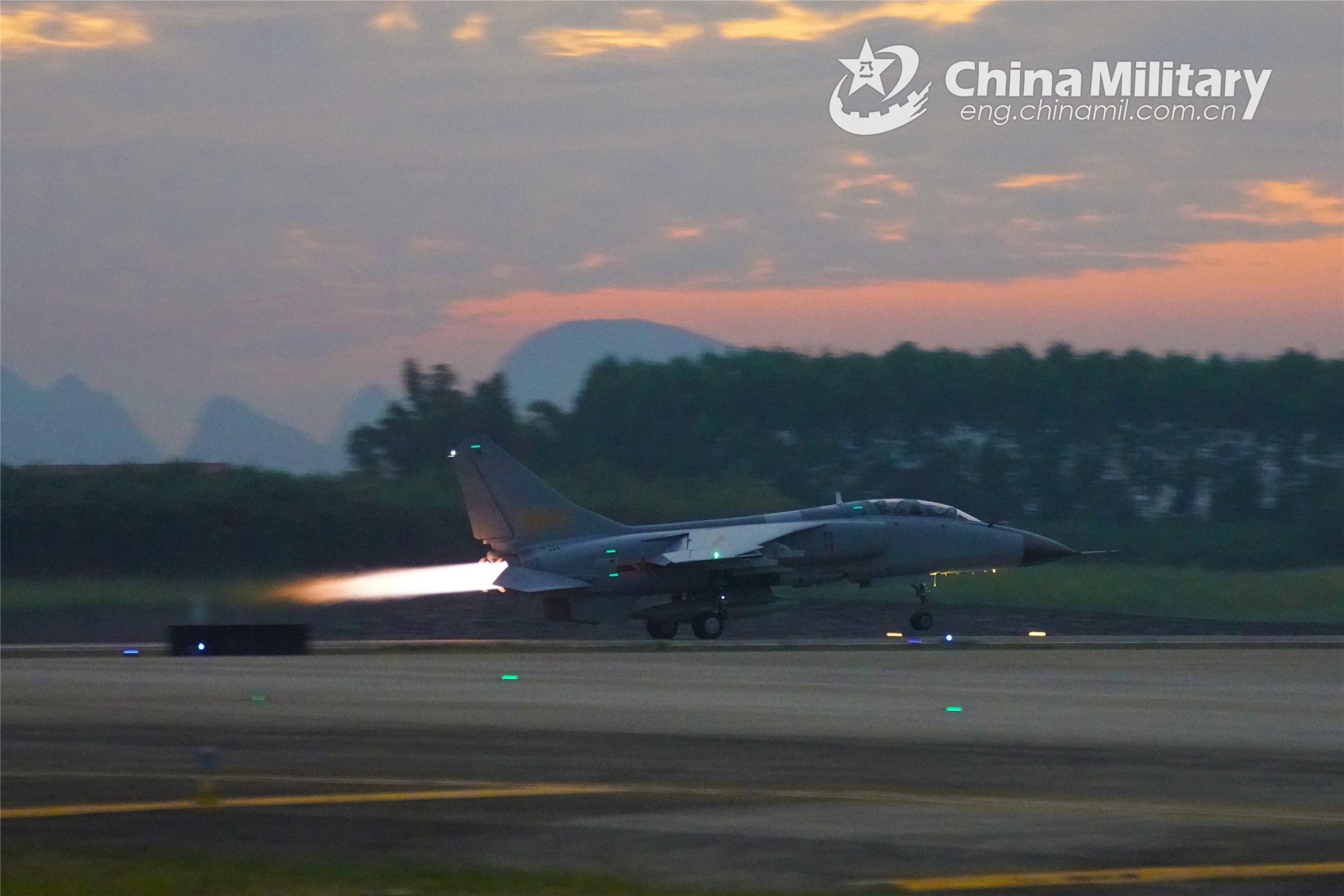 A JH-7 fighter bomber attached to an aviation brigade under the PLA Southern Theater Command takes off in full speed during a round-the-clock flight training exercise on October 21, 2022. (eng.chinamil.com.cn/Photo by Xu Jingcheng)