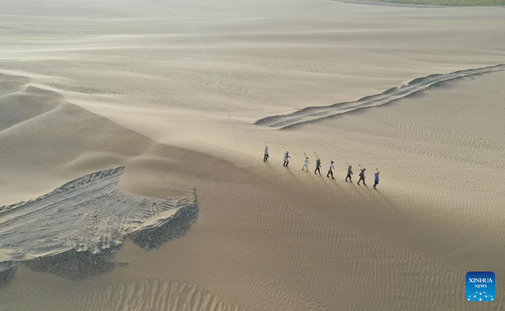 This aerial photo taken on July 5, 2022 shows veterans walking in the Taklimakan Desert in northwest China's Xinjiang Uygur Autonomous Region. (Xinhua/Li Xiang)