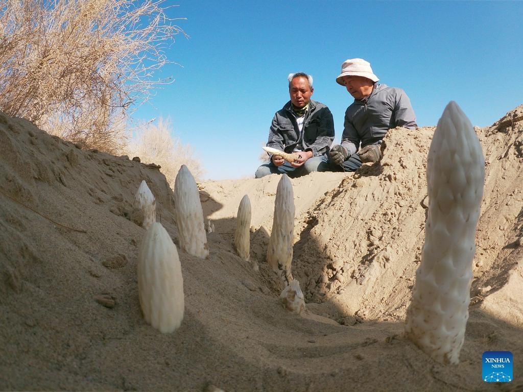 Veterans pick cistanche deserticola, a traditional Chinese herbal medicine, in Qiemo, a desert county in northwest China's Xinjiang Uygur Autonomous Region, Oct. 31, 2022. (Photo by Su Xin/Xinhua)