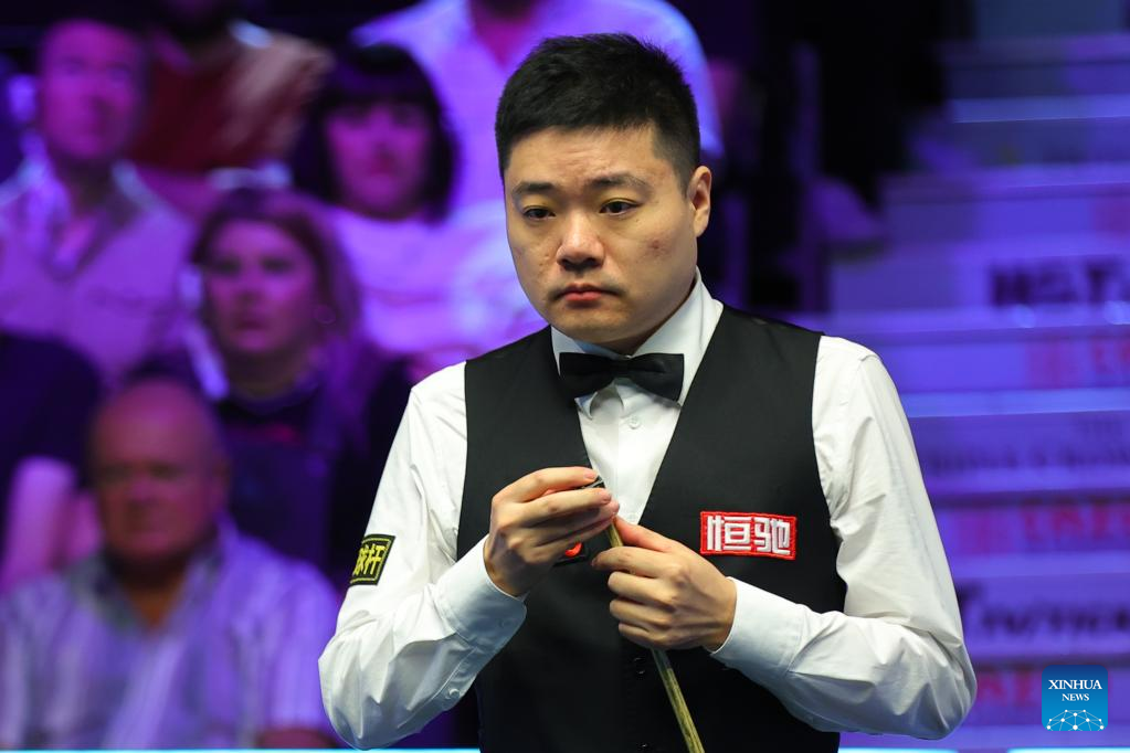 Ding Junhui of China competes during the semifinal match against Tom Ford of England at 2022 UK Snooker Championship in York, Britain, Nov. 19, 2022. (Photo by Zhai Zheng/Xinhua)