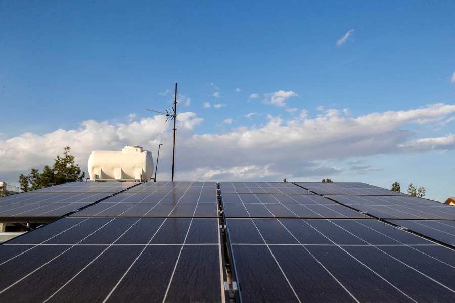 Solar panels are seen on the roof of a house in Nicosia, Cyprus on Nov. 18, 2022. (Photo by George Christophorou/Xinhua)