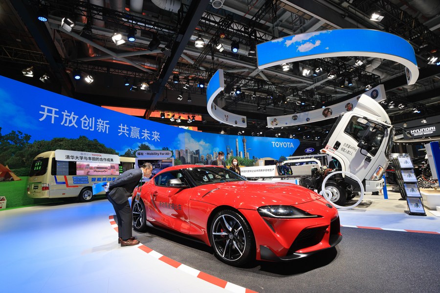 A visitor looks at a car at the booth of Toyota at the fifth China International Import Expo (CIIE) in east China's Shanghai, Nov. 6, 2022. (Xinhua/Li Jing)