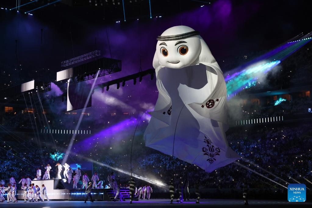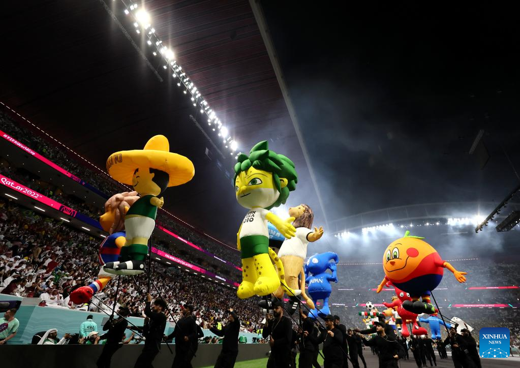 Mascots of previous World Cups are seen during the opening ceremony before the Group A match between Qatar and Ecuador at the 2022 FIFA World Cup at Al Bayt Stadium in Al Khor, Qatar, on Nov. 20, 2022. (Xinhua/Lan Hongguang)