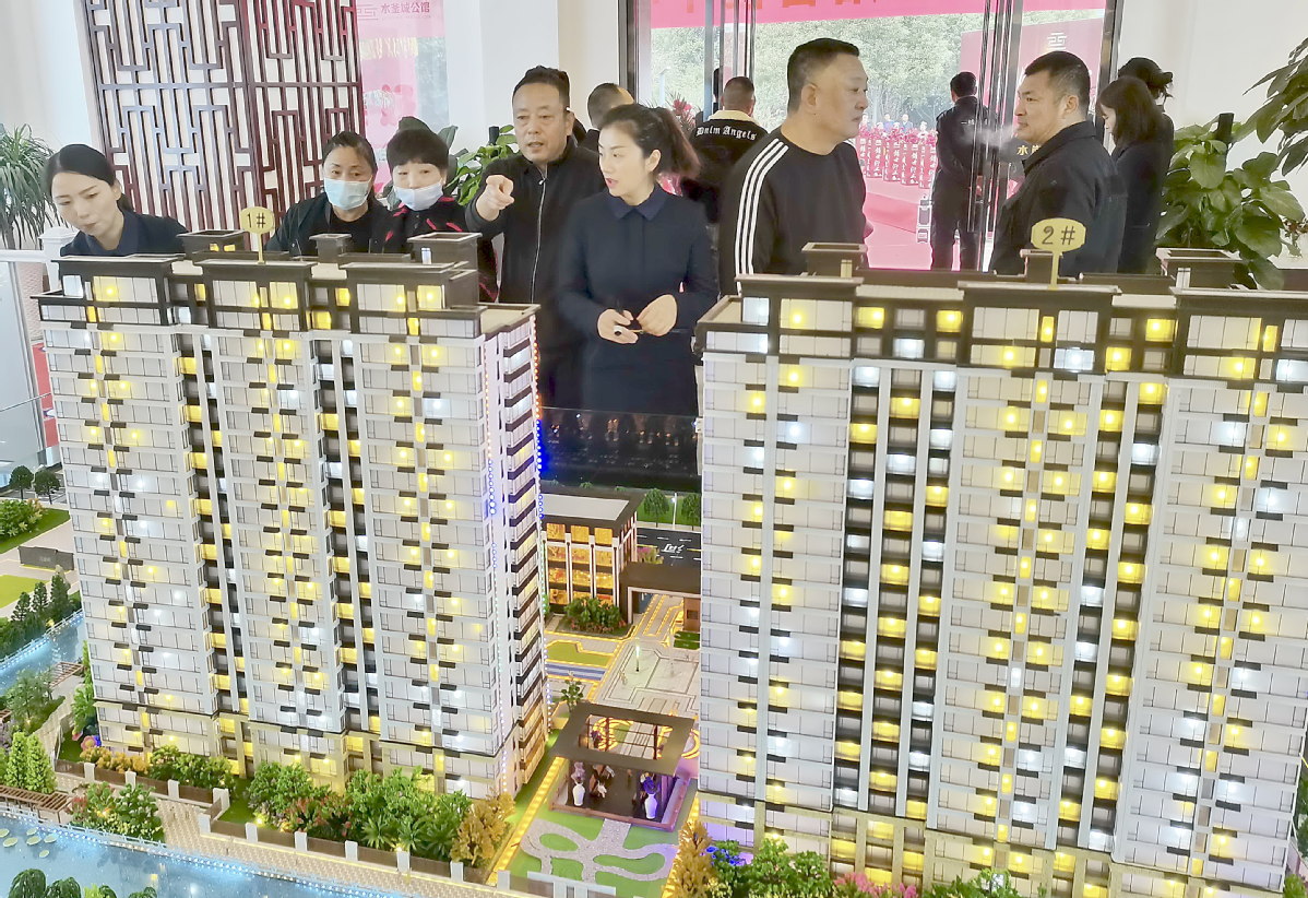 Potential homebuyers look at property models in Huaian, Jiangsu province. [Photo by Chen Liang/For China Daily]