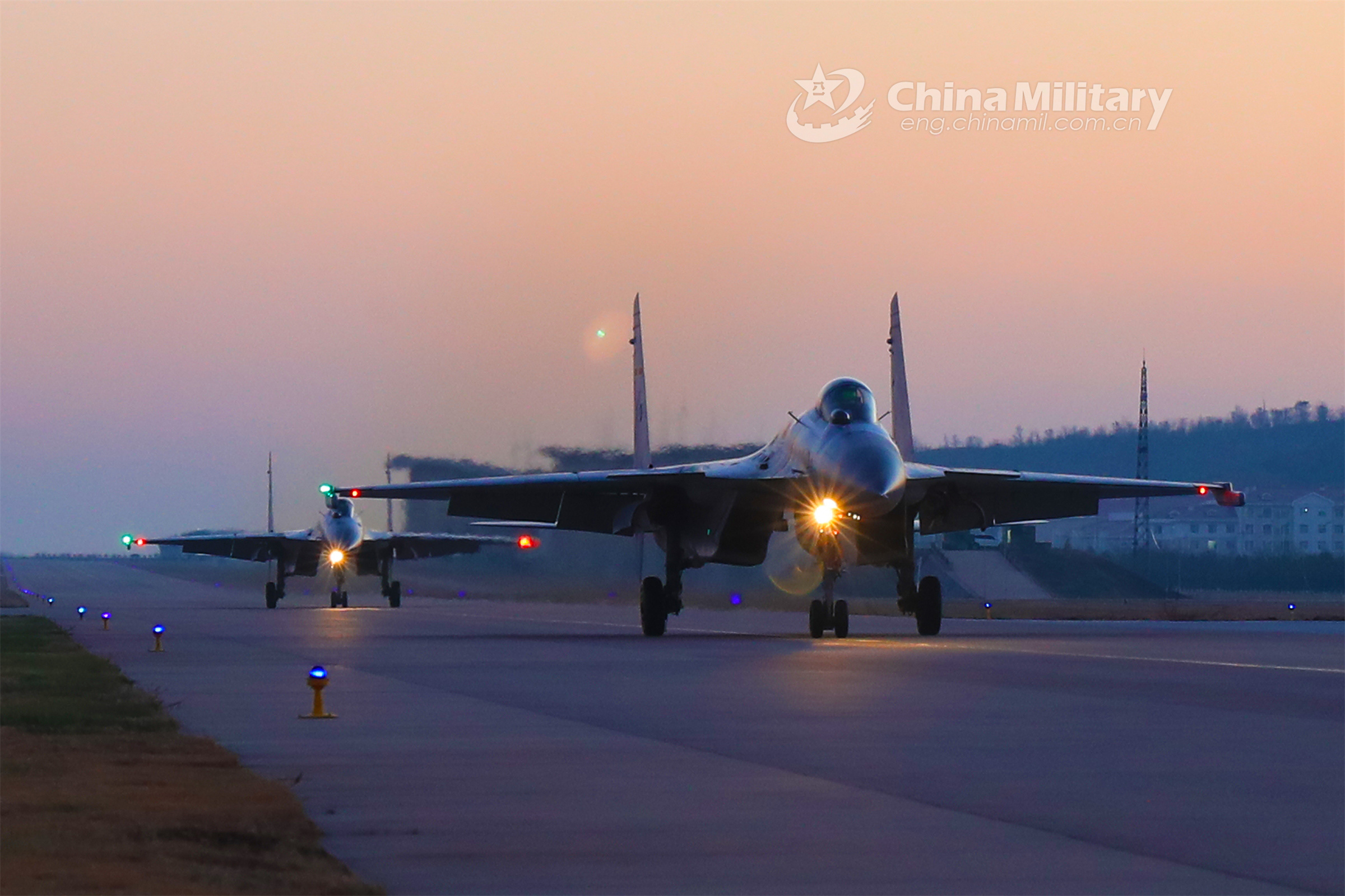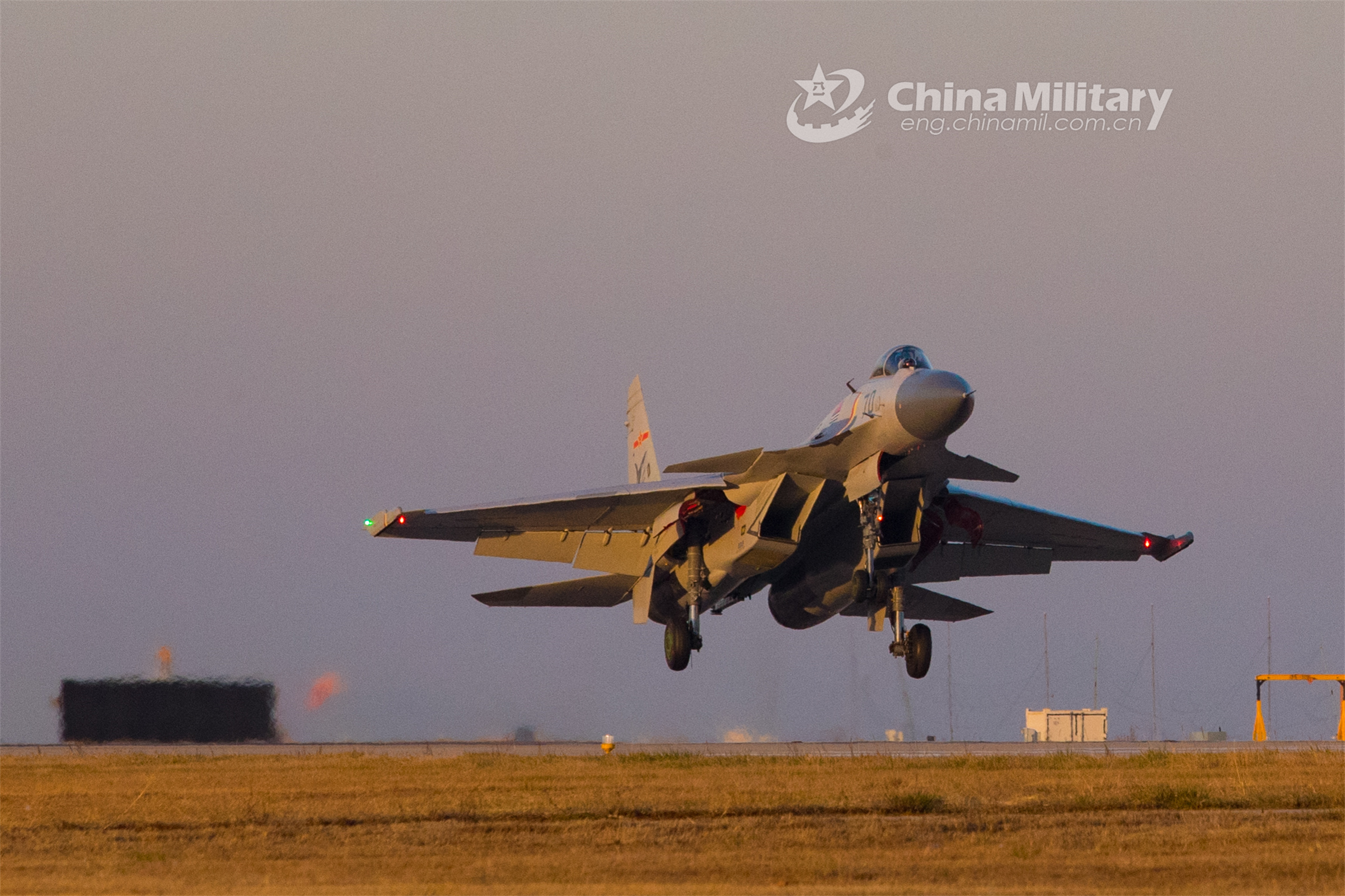 A fighter jet attached to a training base under the PLA Naval Aviation University takes off for a sortie during a flight training course in mid November, 2022. (eng.chinamil.com.cn/Photo by Jiang Tao)