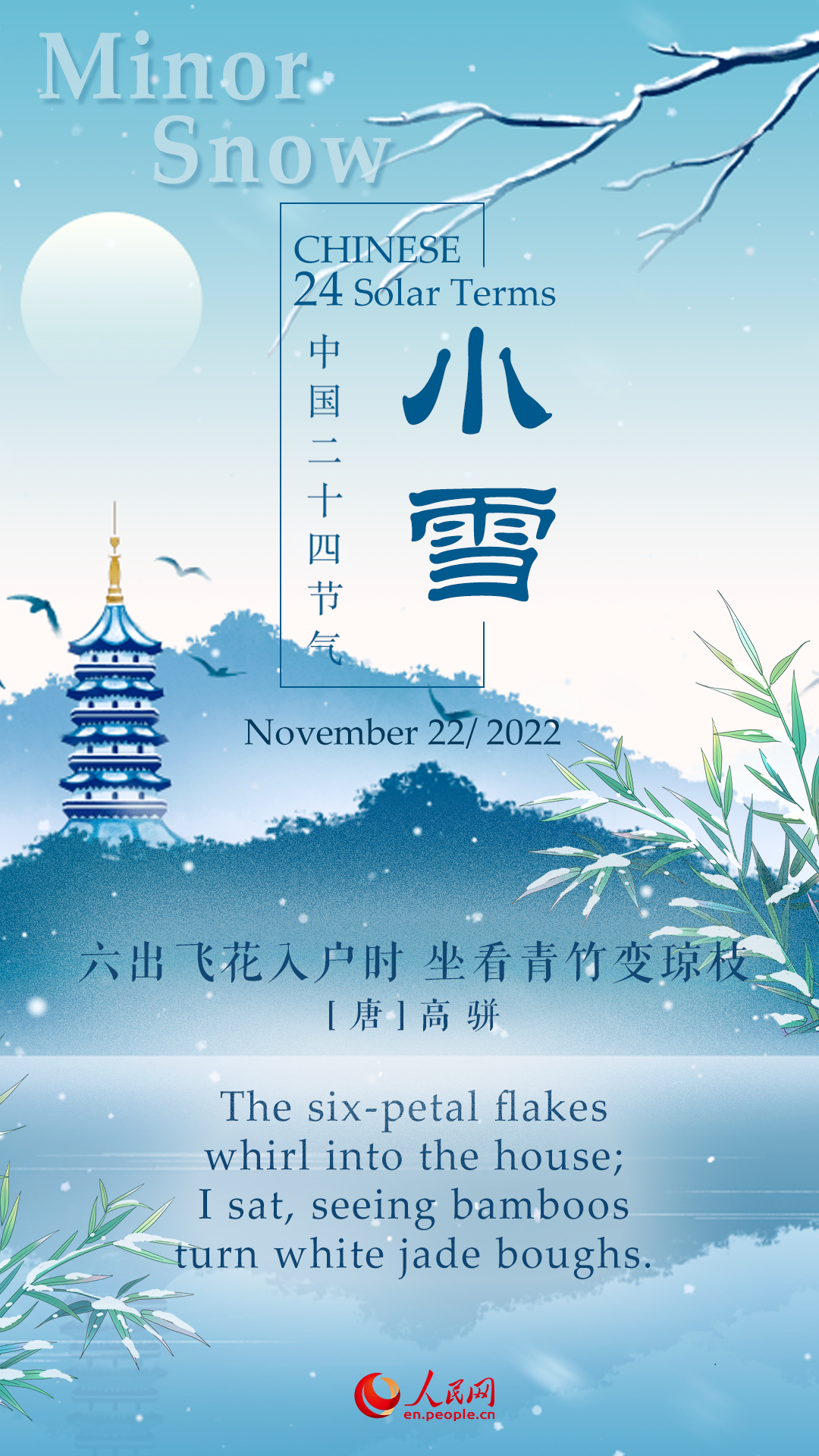 Minor Snow, or "Xiaoxue" in Chinese, is the 20th of the 24 traditional Chinese solar terms. It is the second solar term of winter, and indicates that snow is about to arrive.