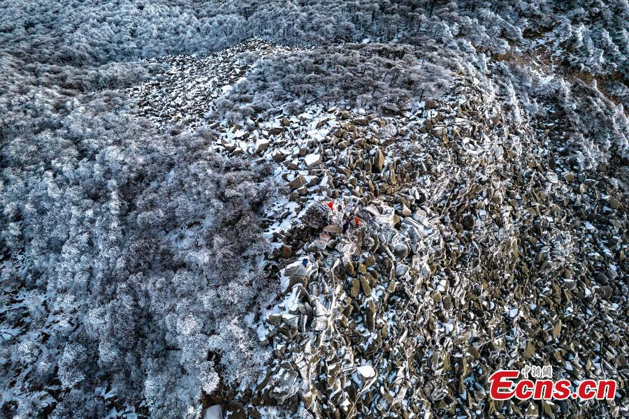 Winter sunrise shines on the mountain peak in Zhuque National Forest Park in Xi'an, northwest China's Shaanxi Province, Nov. 22, 2022, turning it into a white fairyland. (Photo: China News Service/Cheng Wenying)