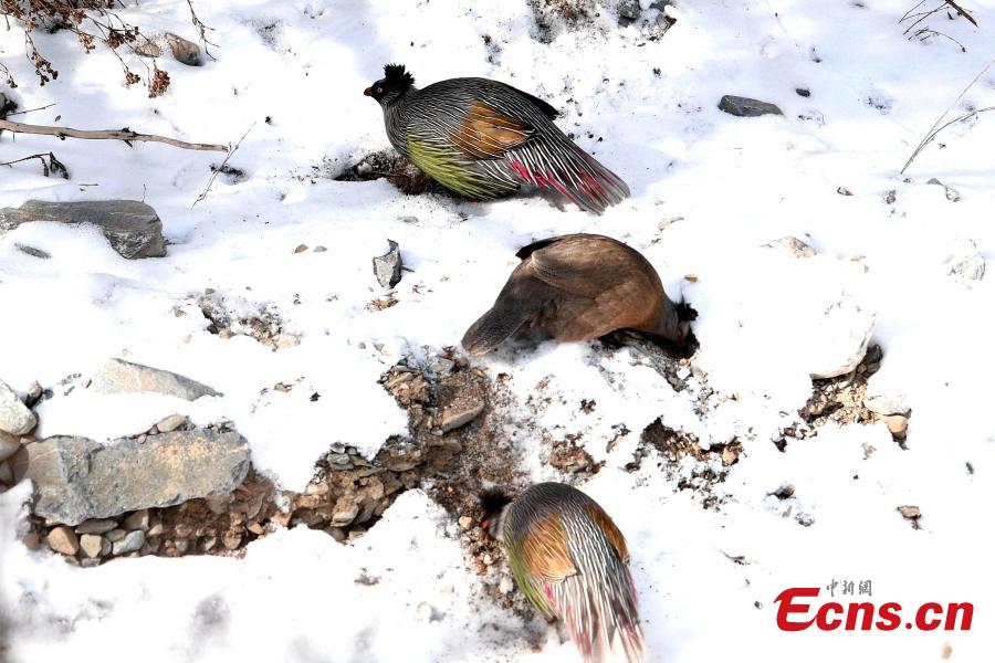 Several blood pheasants forage in Qilian Mountain National Park in northwest China's Qinghai Province. The blood pheasant is native to forests at an altitude of 1,700-3,000 meters in mountainous areas in China and a bird species under the second-class state protection. (Photo: China News Service/Wang Guozhong)