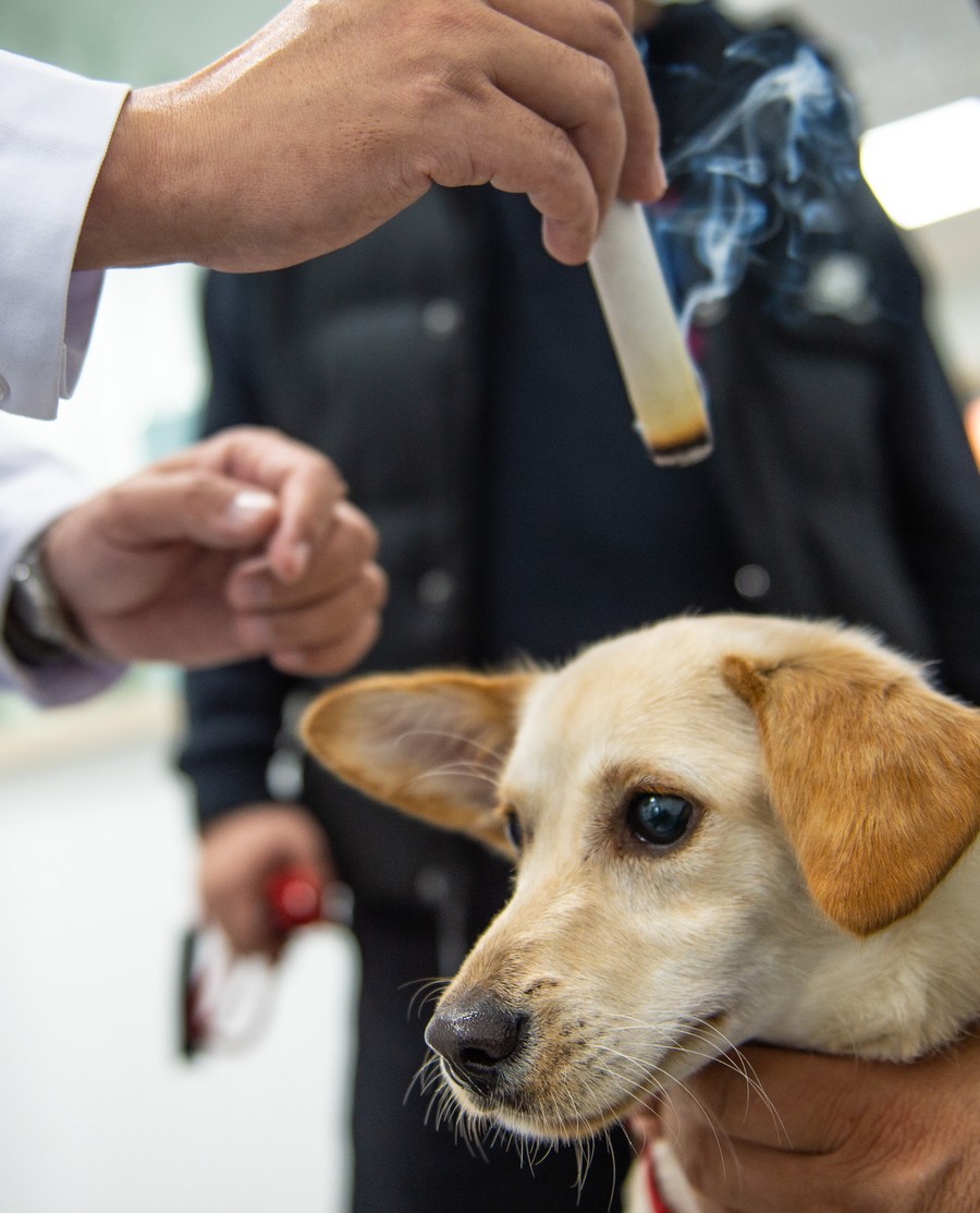 A pet dog receives moxibustion therapy at the Veterinary Teaching Hospital of China Agricultural University (CAU) in Beijing, capital of China, Oct. 29, 2021. (Xinhua/Chen Zhonghao)