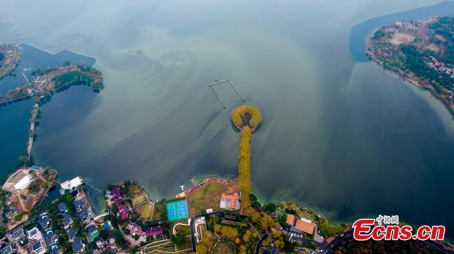 A road surrounded by plane trees in East Lake National Wetland Park looks like a golden spoon on water in Wuhan, central China's Hubei Province, Nov. 21, 2022. (Photo: China News Service/Zhang Chang)