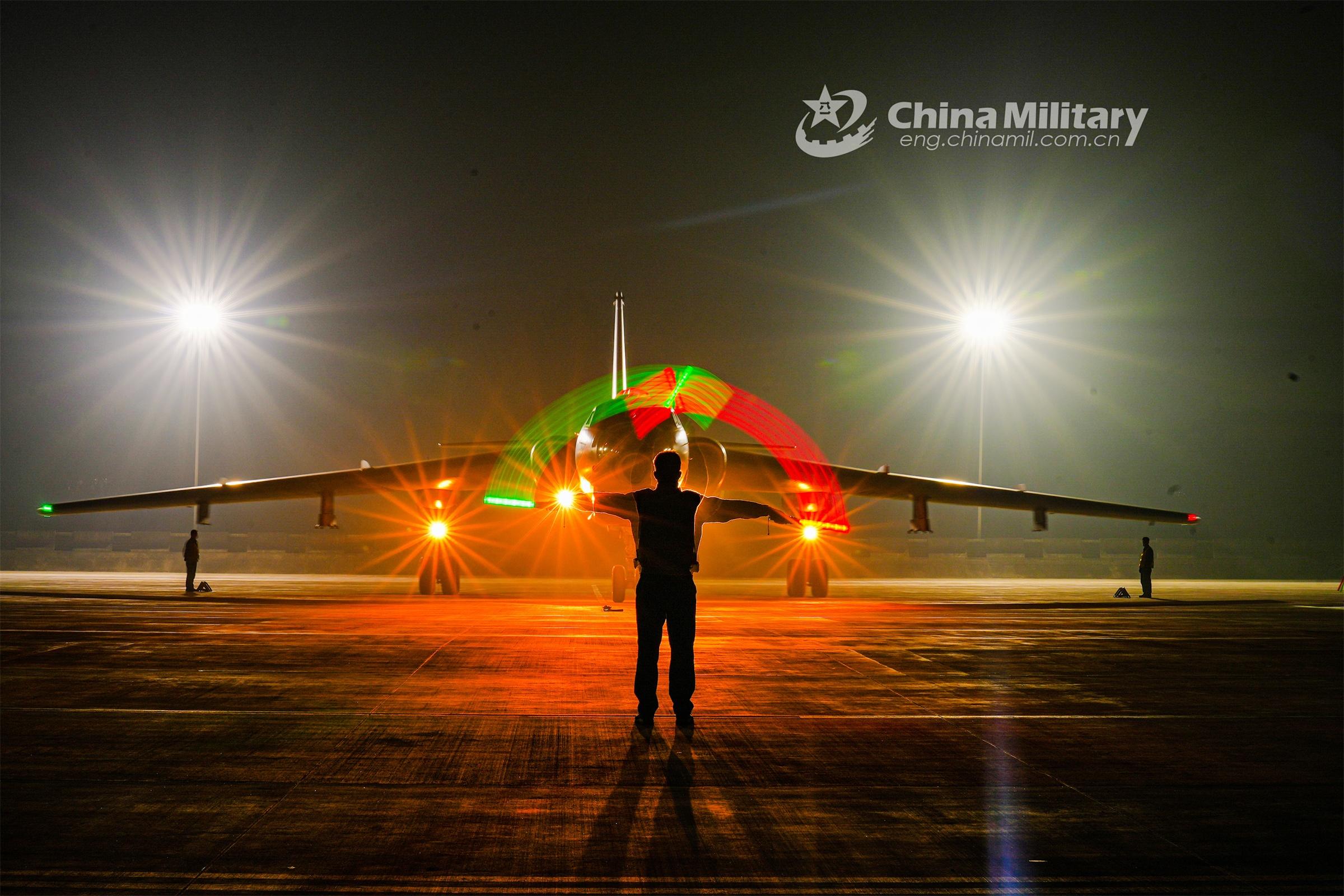A ground crew member assigned to an aviation regiment of the air force under the PLA Central Theater Command signals the aircraft to the apron during a night flight training exercise on November 2, 2022. (eng.chinamil.com.cn/Photo by He Shilong)