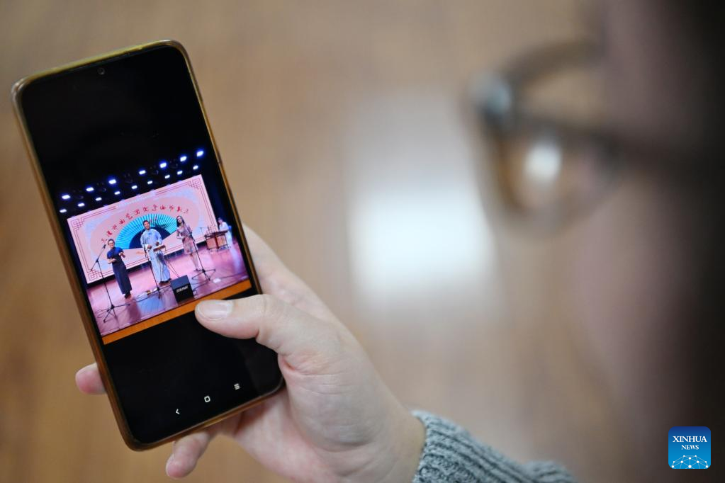 Amiris Rodrigues Barros displays photos of her stage performance in a classroom of Nankai University in north China's Tianjin, Nov. 20, 2022. (Xinhua/Li Ran)