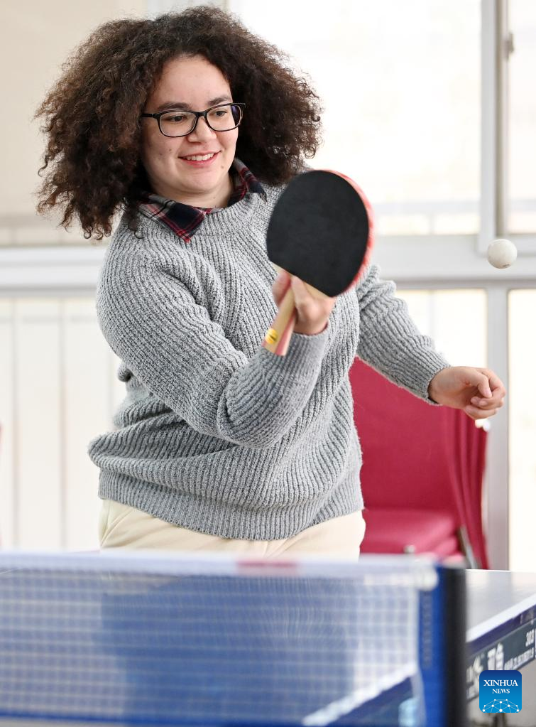 Amiris Rodrigues Barros plays table tennis in an activity room in the campus of Nankai University in north China's Tianjin, Nov. 20, 2022. (Xinhua/Li Ran)