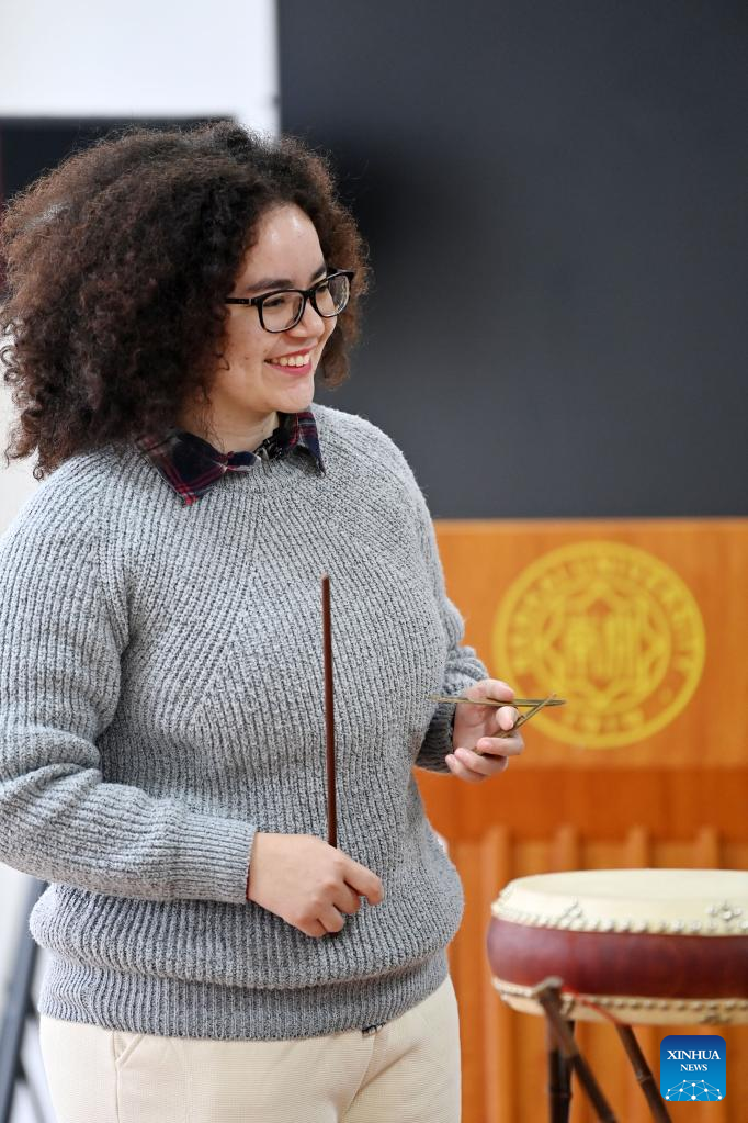 Amiris Rodrigues Barros practices the "Jingdong Dagu" in a classroom of Nankai University in north China's Tianjin, Nov. 20, 2022. (Xinhua/Li Ran)
