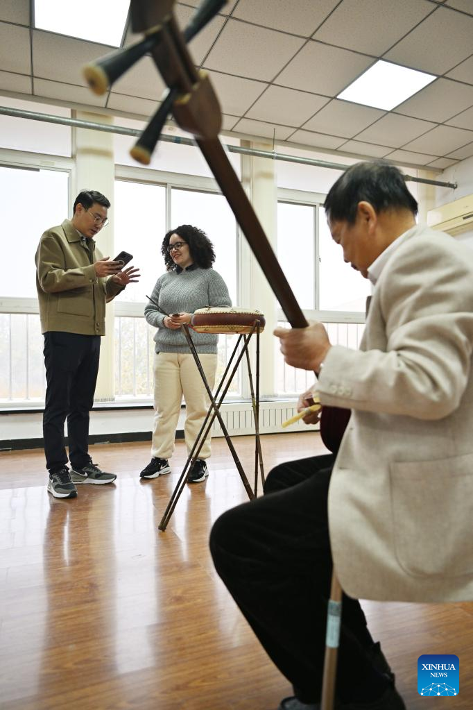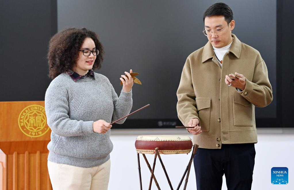 Amiris Rodrigues Barros (C) learns the "Jingdong Dagu" from her master Wang Wenlei (L) in a classroom of Nankai University in north China's Tianjin, Nov. 20, 2022. (Xinhua/Li Ran)