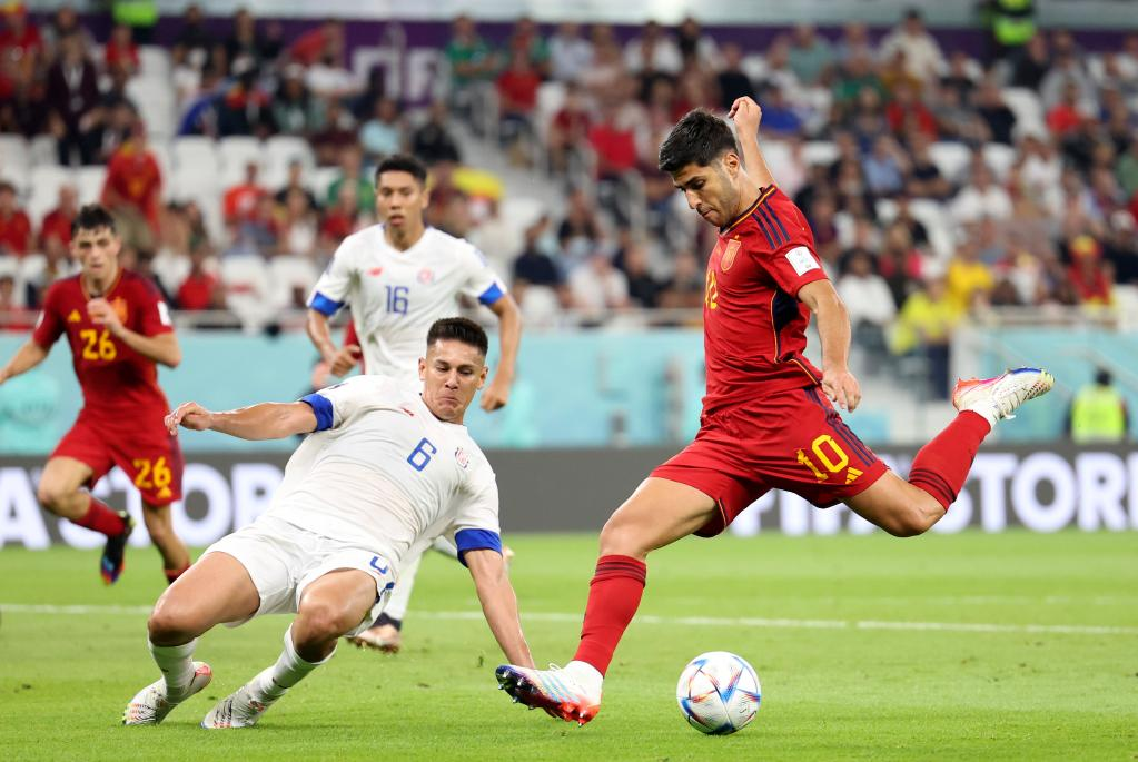 Marco Asensio of Spain shoots during the Group E match between Spain and Costa Rica at the 2022 FIFA World Cup at Al Thumama Stadium in Doha, Qatar, Nov. 23, 2022. (Xinhua/Li Ming)