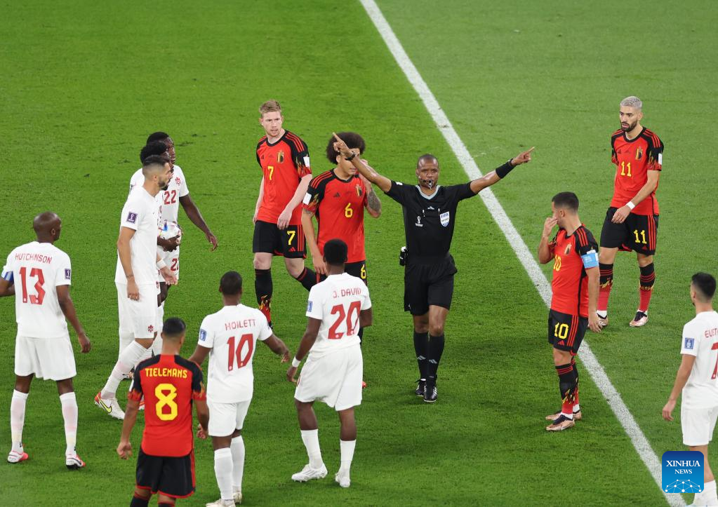 Referee Janny Sikazwe (4th R) makes the VAR sign during the Group F match between Belgium and Canada at the 2022 FIFA World Cup at Ahmad Bin Ali Stadium in Al Rayyan, Qatar, Nov. 23, 2022. (Xinhua/Xu Zijian)