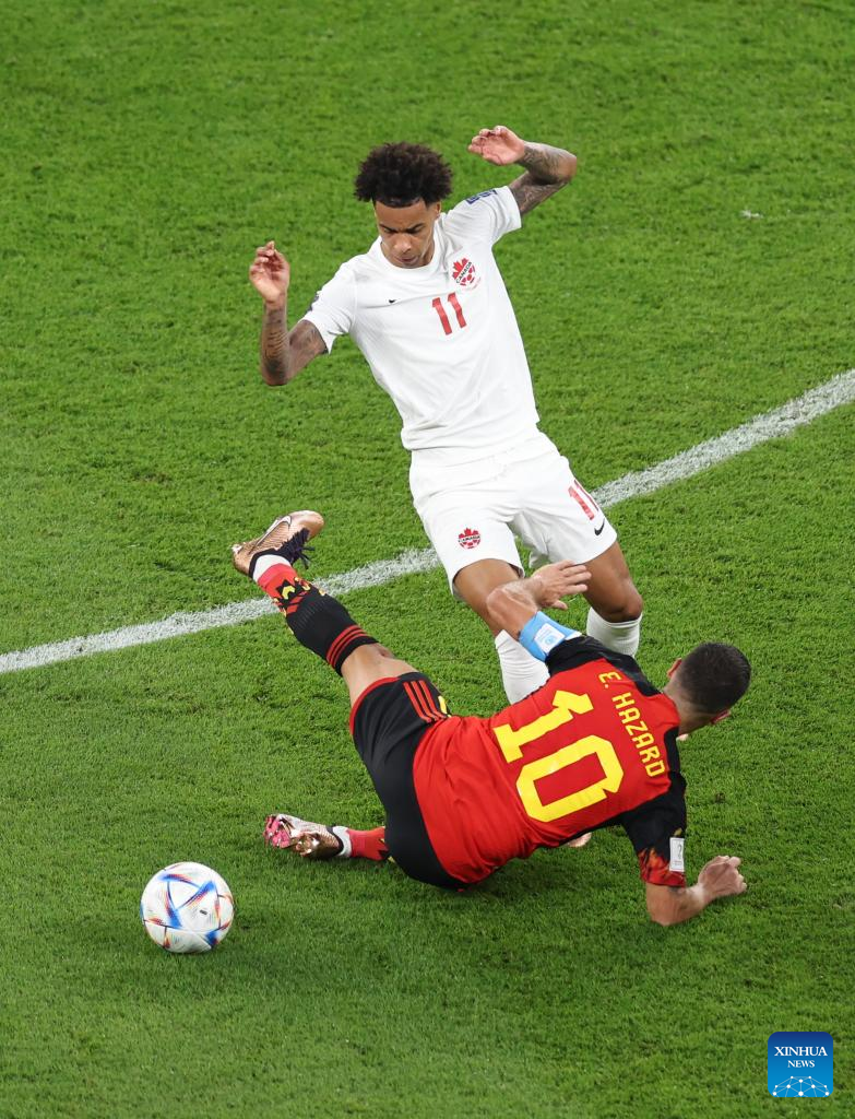 Tajon Buchanan (top) of Canada vies with Eden Hazard of Belgium during the Group F match between Belgium and Canada at the 2022 FIFA World Cup at Ahmad Bin Ali Stadium in Al Rayyan, Qatar, Nov. 23, 2022. (Xinhua/Xu Zijian)