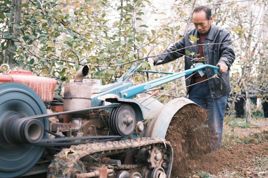 Li Yuhong, an apple grower, digs ditches with a ditcher at his apple orchard in Anshan village, Luochuan county, Yan’an city, northwest China’s Shaanxi Province. (People’s Daily Online/Wu Chao)