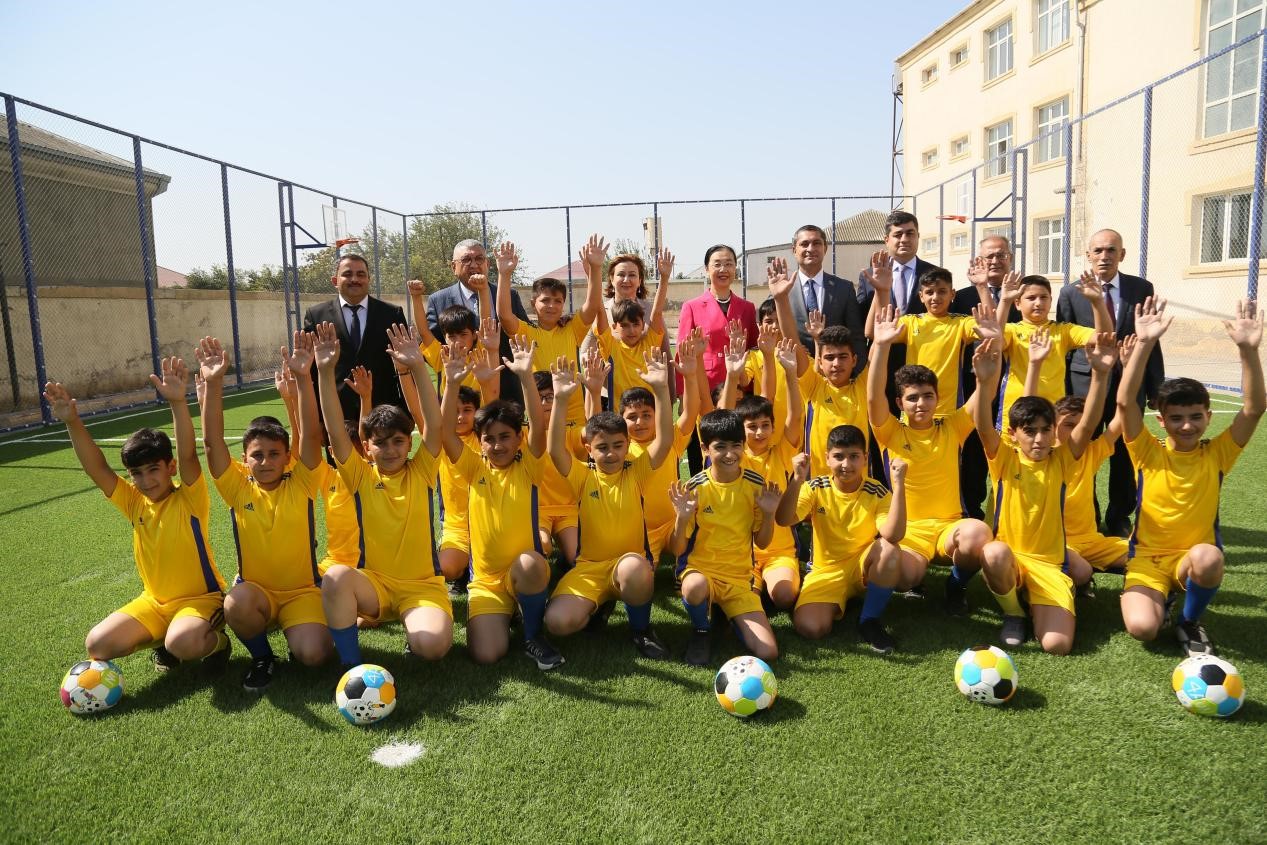 Chinese Ambassador to Azerbaijan Guo Min attends the completion ceremony of a China-aided playfield of a middle school in Baku, capital of Azerbaijan, Sept. 17, 2021. Under the efforts made by the Chinese Embassy in Azerbaijan and the Heydar Aliyev Foundation, a number of school renovation and upgrading projects have been launched in Azerbaijan, benefiting more and more local students. (Photo courtesy of the Chinese Embassy in Azerbaijan)
