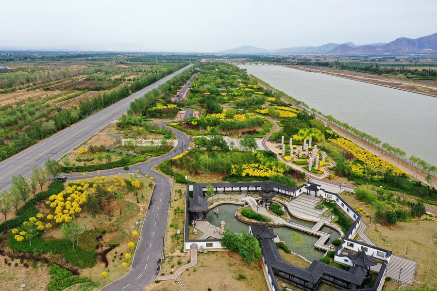 This aerial photo taken on May 19, 2021 shows a view of the Sangganhe riverside park in Zhuolu County of Zhangjiakou City, north China's Hebei Province. (Xinhua/Mu Yu)