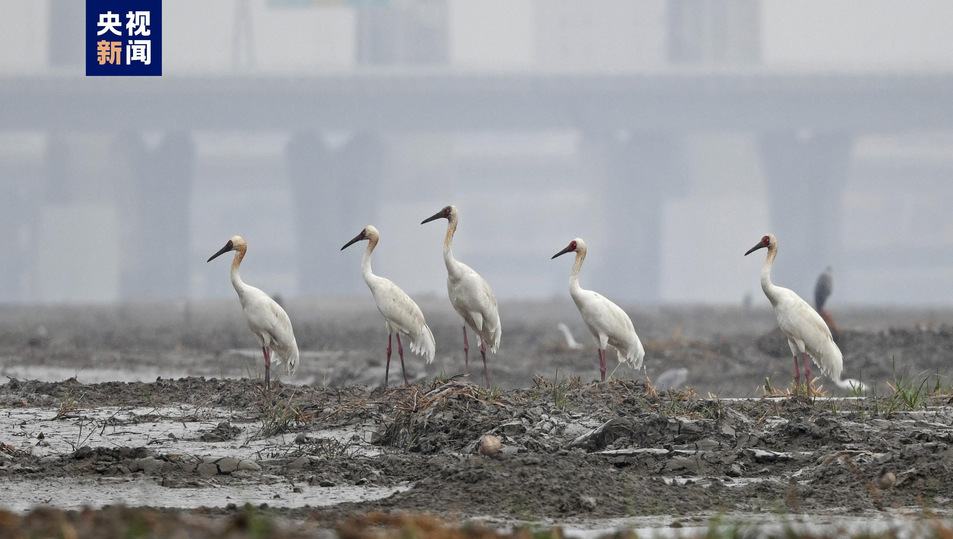 Photo shows white cranes, a critically endangered bird species, at a nature reserve in Quanzhou city, southeast China’s Fujian Province. (Photo/CCTV News)