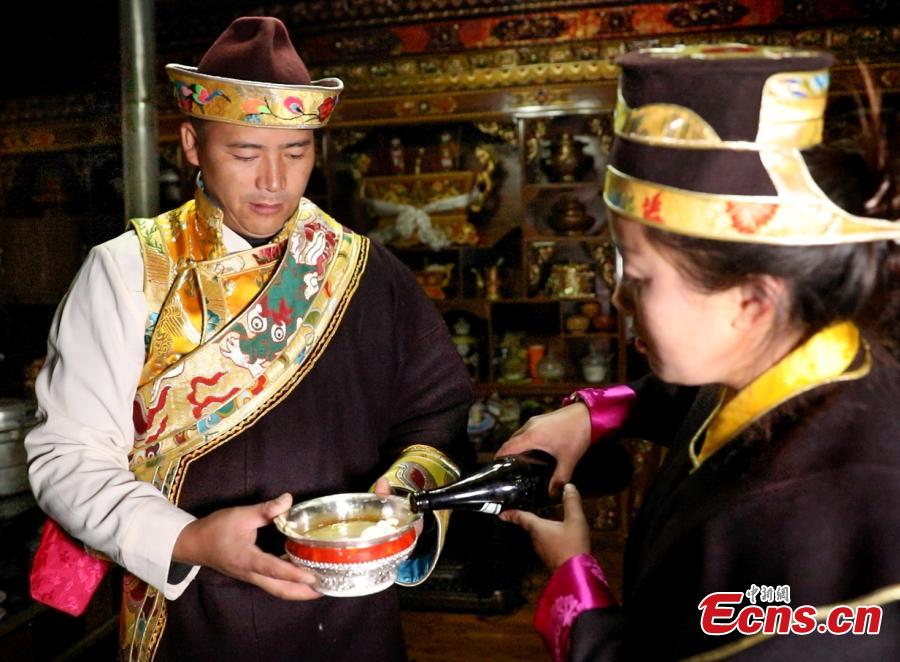 Locals drink highland barley wine to celebrate the Gongbo New Year by the Tibetan calendar, which falls on Nov. 24 this year, in Nyingchi city, southwest China’s Tibet Autonomous Region, Nov. 24, 2022. (Photo/China News Service)