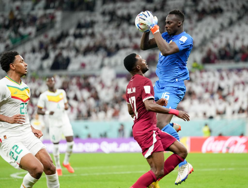 Edouard Mendy (top), goalkeeper of Senegal, picks the ball during the Group A match between Qatar and Senegal at the 2022 FIFA World Cup at Al Thumama Stadium in Doha, Qatar, Nov. 25, 2022. (Xinhua/Zheng Huansong)
