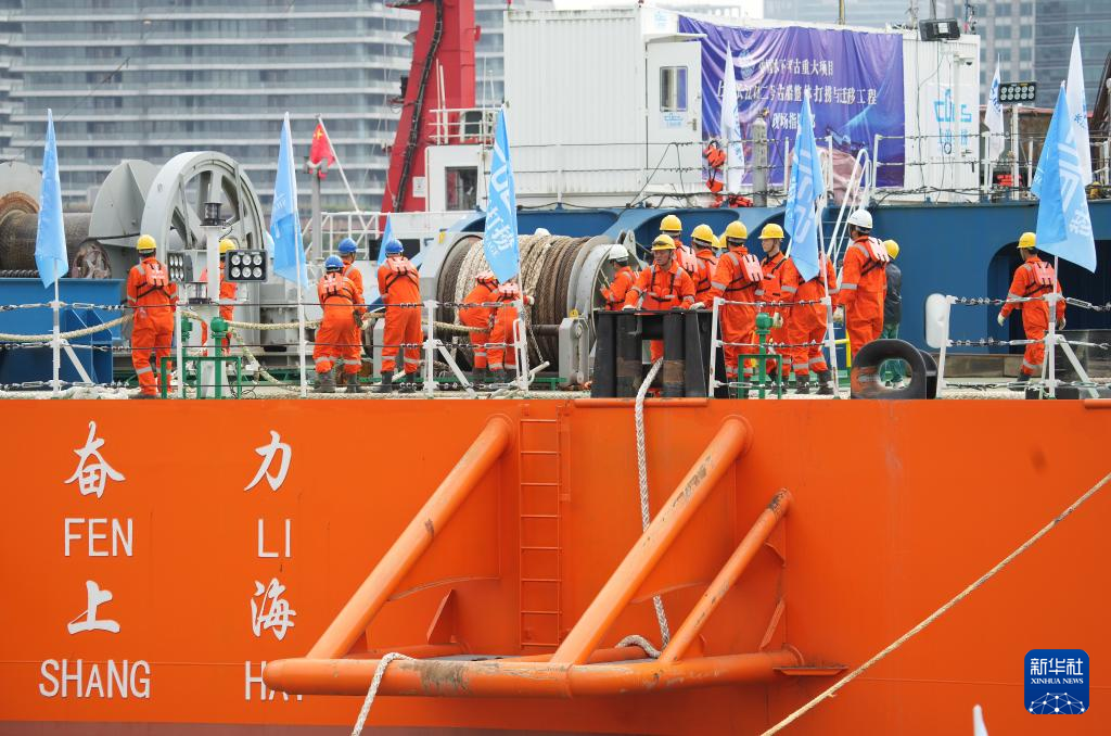 Staff members work as the Yangtze No. 2 Ancient Shipwreck is transferred to a dock near the Huangpu River in Shanghai, east China, Nov. 25, 2022.
