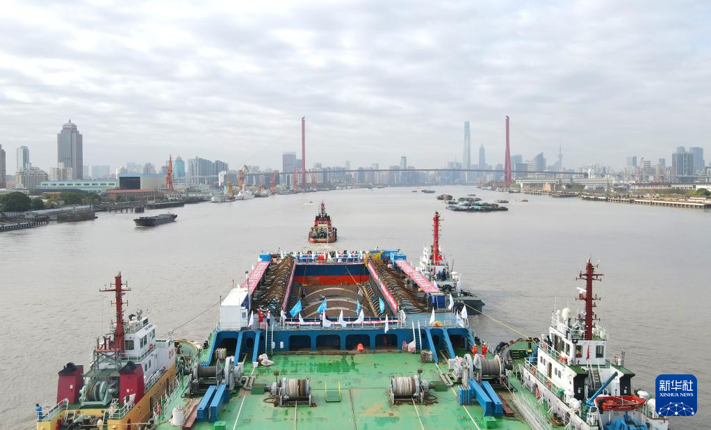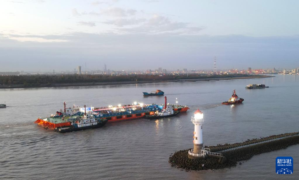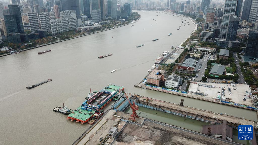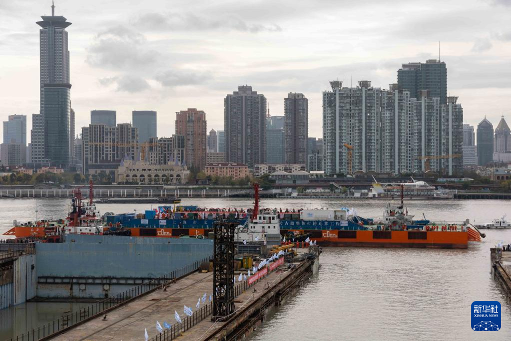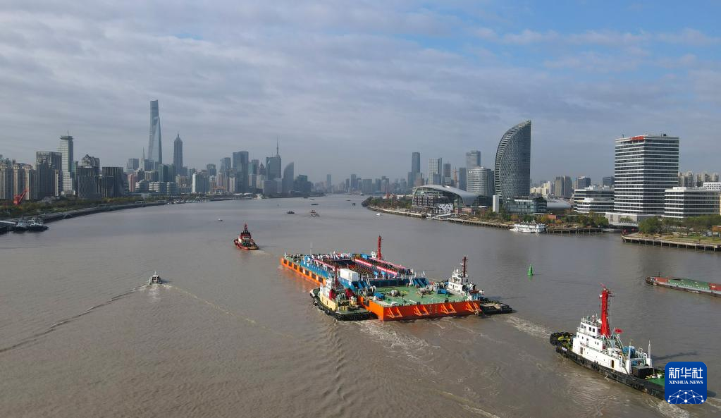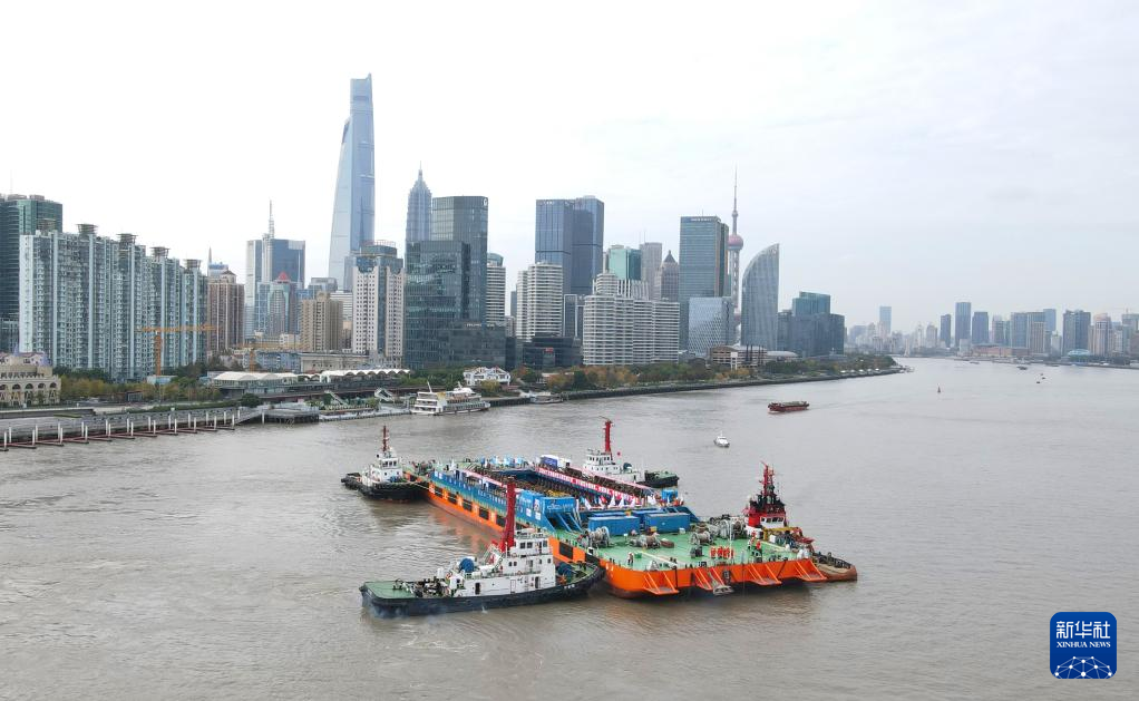 The Yangtze No. 2 Ancient Shipwreck is transferred to a dock near the Huangpu River in Shanghai, east China, Nov. 25, 2022.