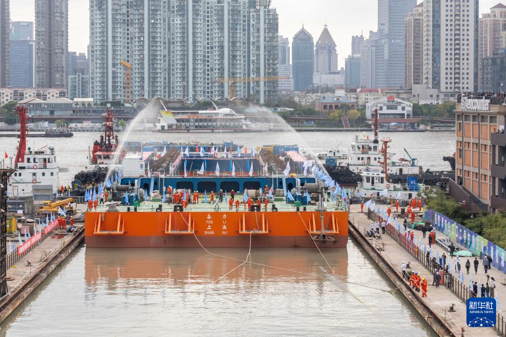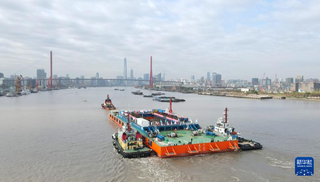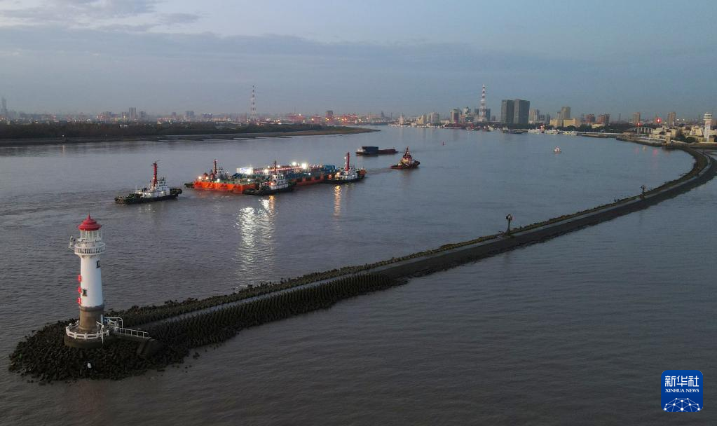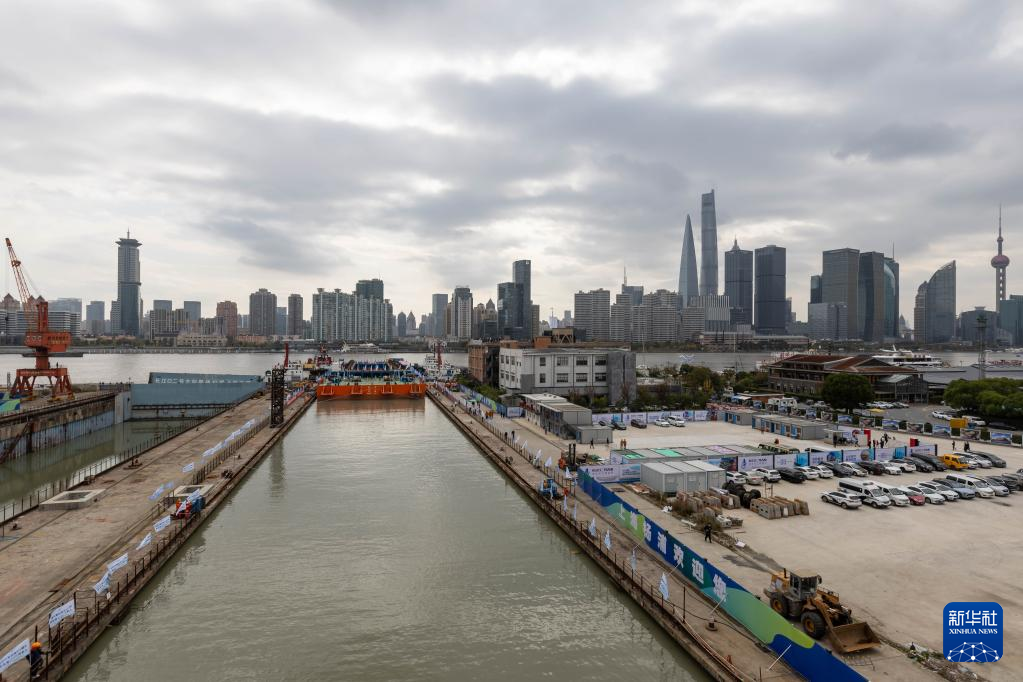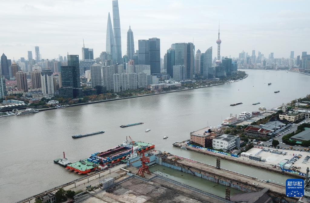 The Yangtze No. 2 Ancient Shipwreck is transferred to a dock near the Huangpu River in Shanghai, east China, Nov. 25, 2022.