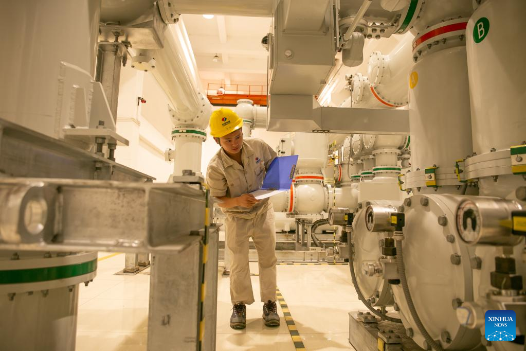 A staff member of PowerChina works at the Nam Ou 7 hydropower plant of the Nam Ou River Cascade Hydropower Project in northern Laos' Phongsaly Province, on Sept. 27, 2022. The Nam Ou river cascade hydropower project invested and built by the Power Construction Corporation of China (PowerChina) has brought development opportunities to the remote hilly regions in northern Laos. (Photo by Kaikeo Saiyasane/Xinhua)