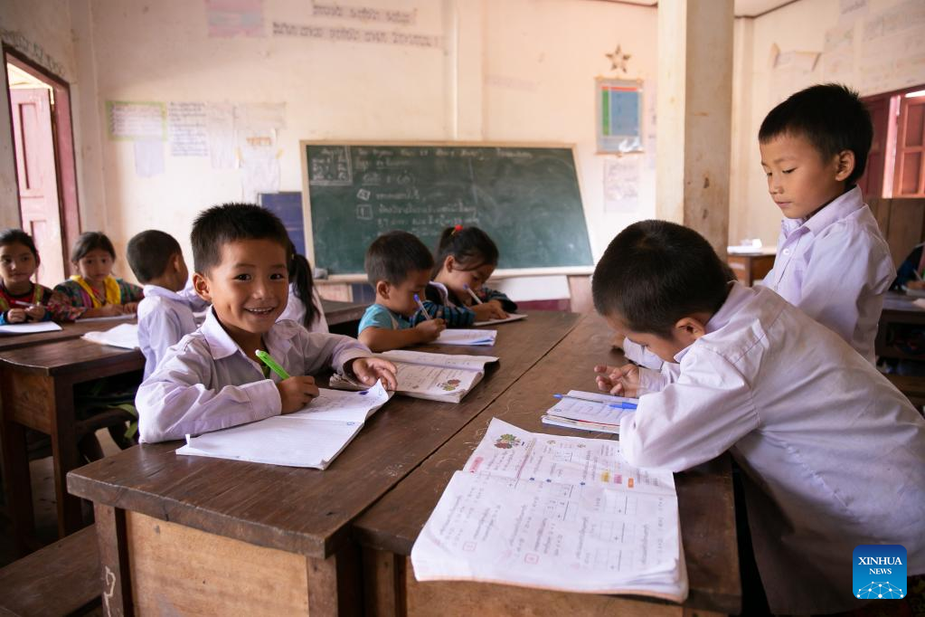 Pupils are pictured at a school built in a new resettlement village near the Nam Ou 7 hydropower plant of the Nam Ou River Cascade Hydropower Project in northern Laos' Phongsaly Province, on Sept. 27, 2022. The Nam Ou river cascade hydropower project invested and built by the Power Construction Corporation of China (PowerChina) has brought development opportunities to the remote hilly regions in northern Laos. (Photo by Kaikeo Saiyasane/Xinhua)