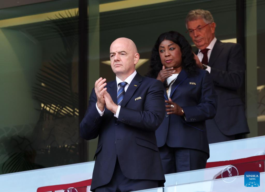 FIFA President Gianni Infantino (front) reacts before the Group B match between Wales and Iran at the 2022 FIFA World Cup at Ahmad Bin Ali Stadium in Al Rayyan, Qatar, Nov. 25, 2022. (Xinhua/Xu Zijian)
