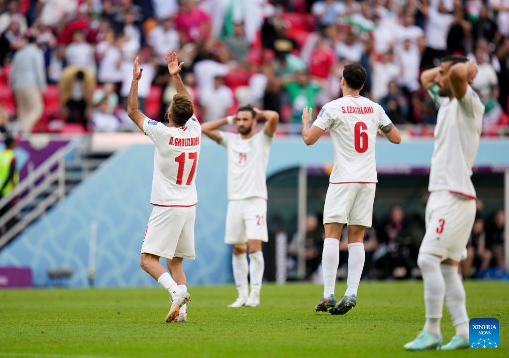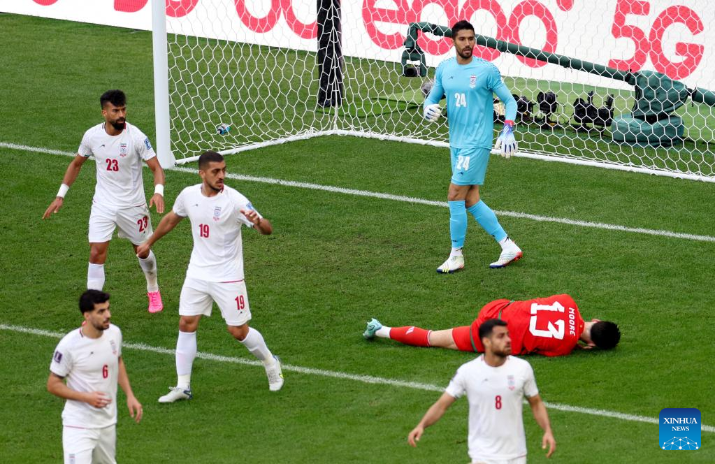 Ali Gholizadeh (1st L) and Saeid Ezatolahi (3rd L) of Iran react during the Group B match between Wales and Iran at the 2022 FIFA World Cup at Ahmad Bin Ali Stadium in Al Rayyan, Qatar, Nov. 25, 2022. (Xinhua/Meng Dingbo)