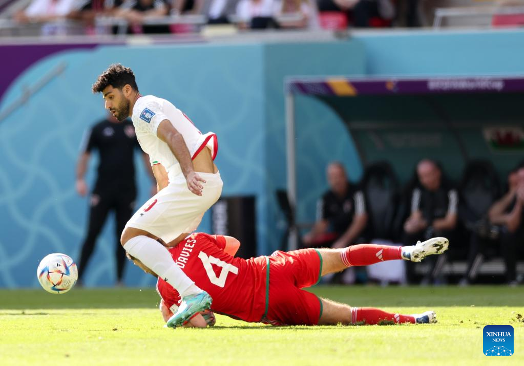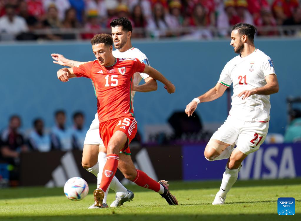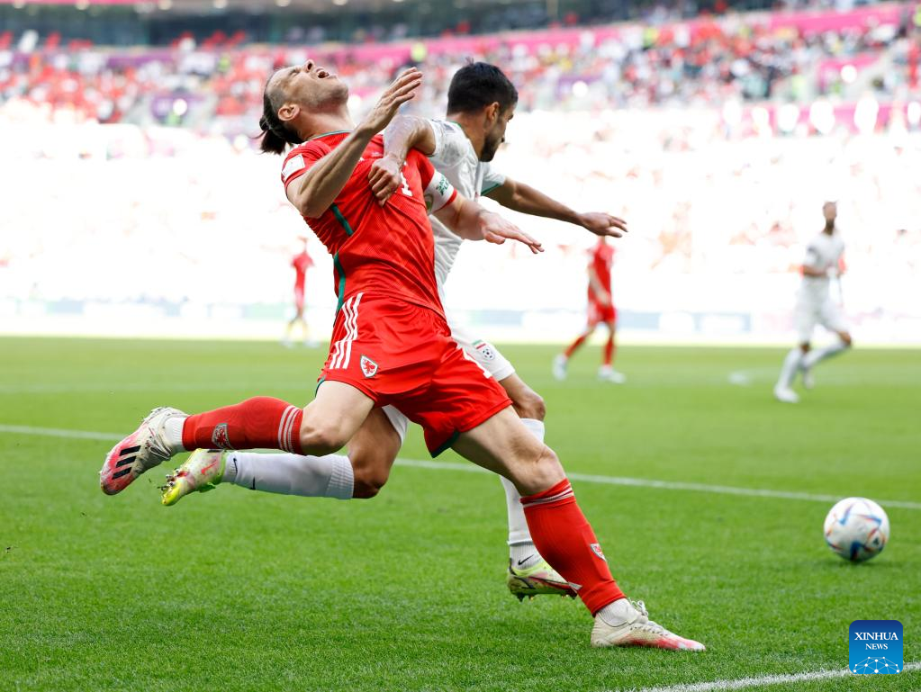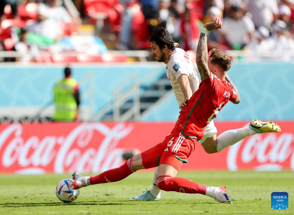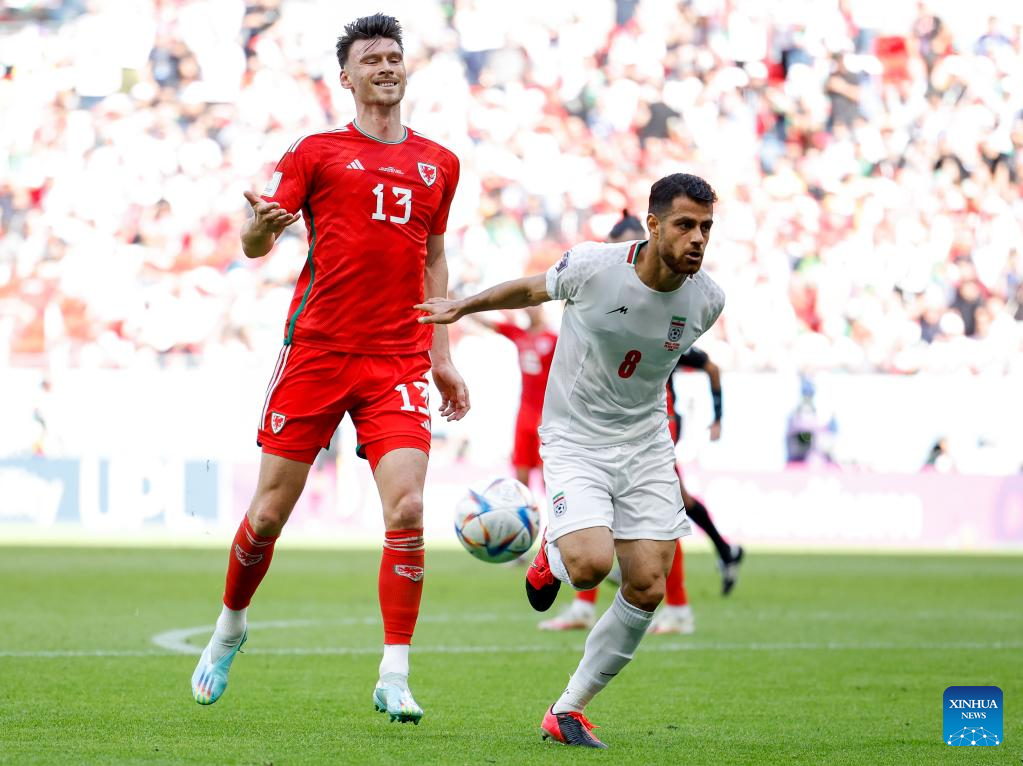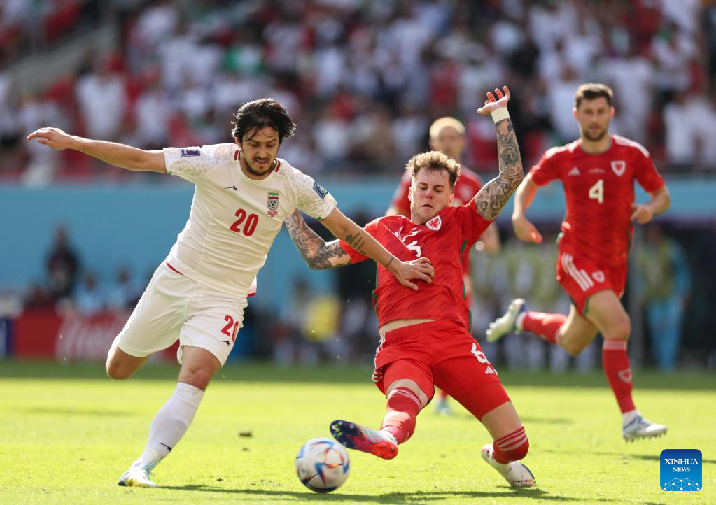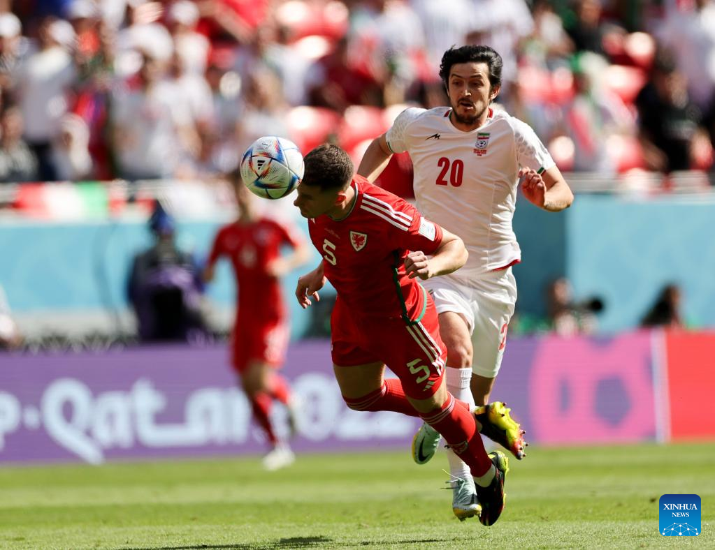 Sardar Azmoun (L) of Iran vies with Joe Rodon of Wales during the Group B match between Wales and Iran at the 2022 FIFA World Cup at Ahmad Bin Ali Stadium in Al Rayyan, Qatar, Nov. 25, 2022. (Xinhua/Xu Zijian)