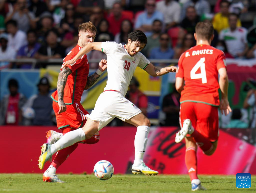 Sardar Azmoun (C) of Iran controls the ball during the Group B match between Wales and Iran at the 2022 FIFA World Cup at Ahmad Bin Ali Stadium in Al Rayyan, Qatar, Nov. 25, 2022. (Xinhua/Meng Dingbo)