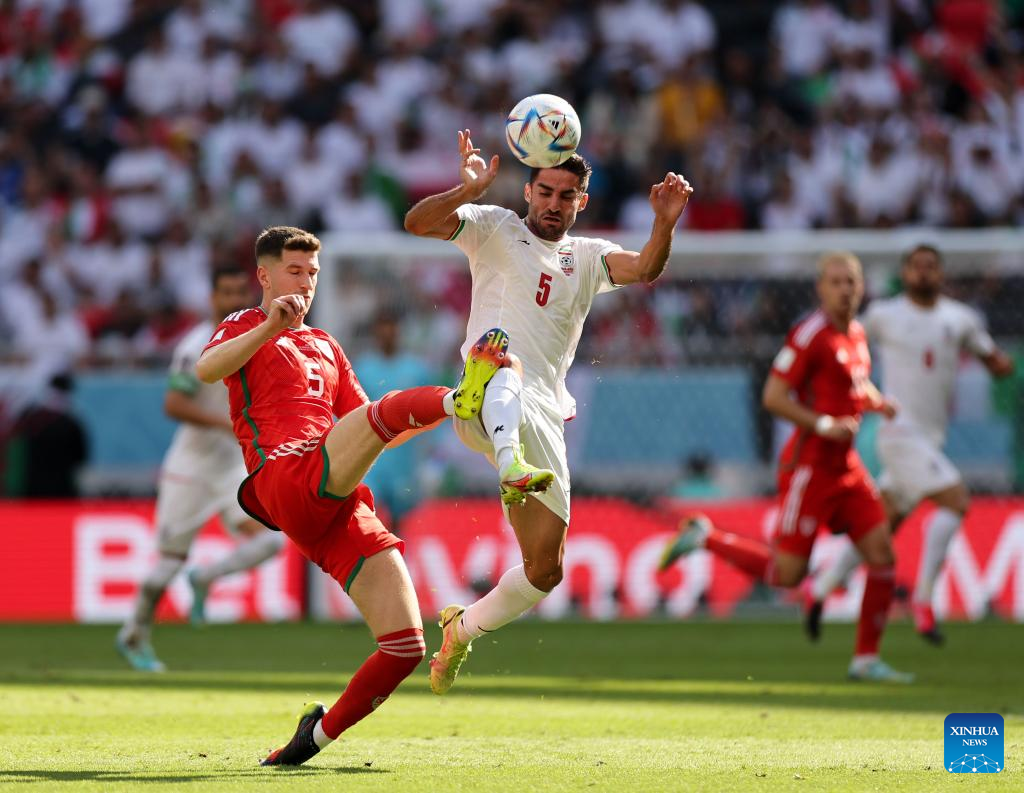 Chris Mepham (L) of Wales vies with Milad Mohammadi of Iran during the Group B match between Wales and Iran at the 2022 FIFA World Cup at Ahmad Bin Ali Stadium in Al Rayyan, Qatar, Nov. 25, 2022. (Xinhua/Cao Can)