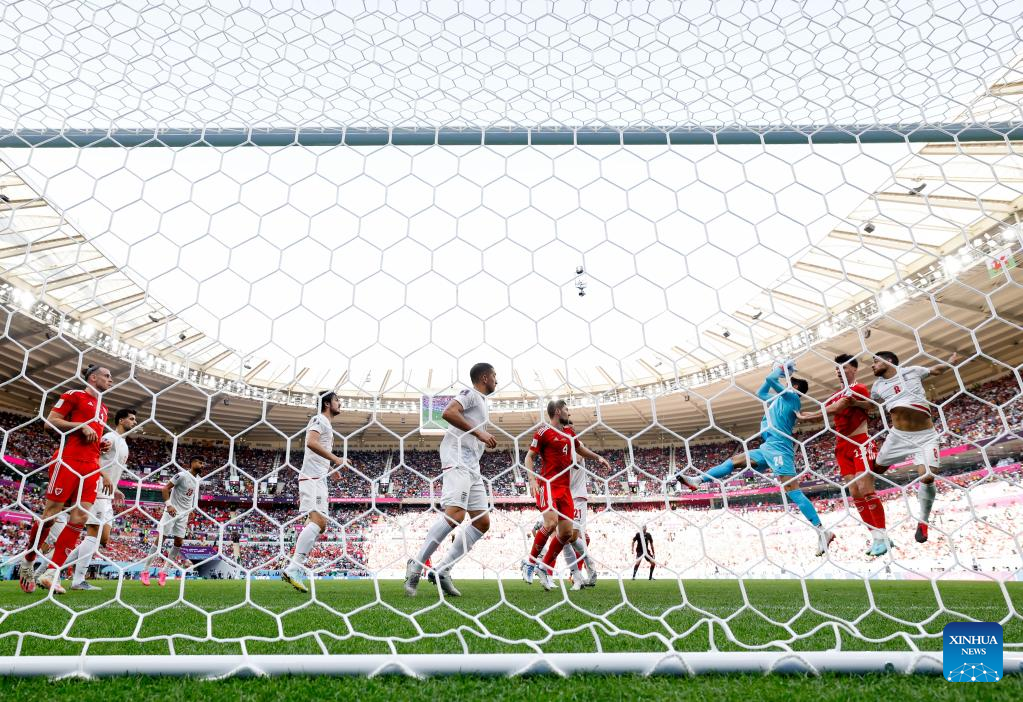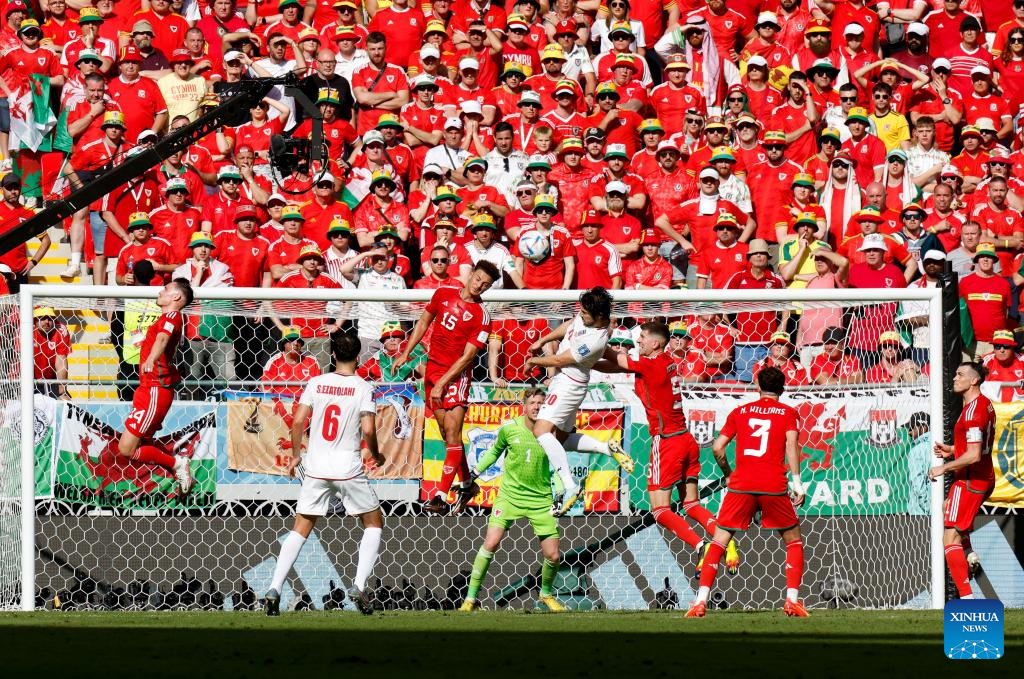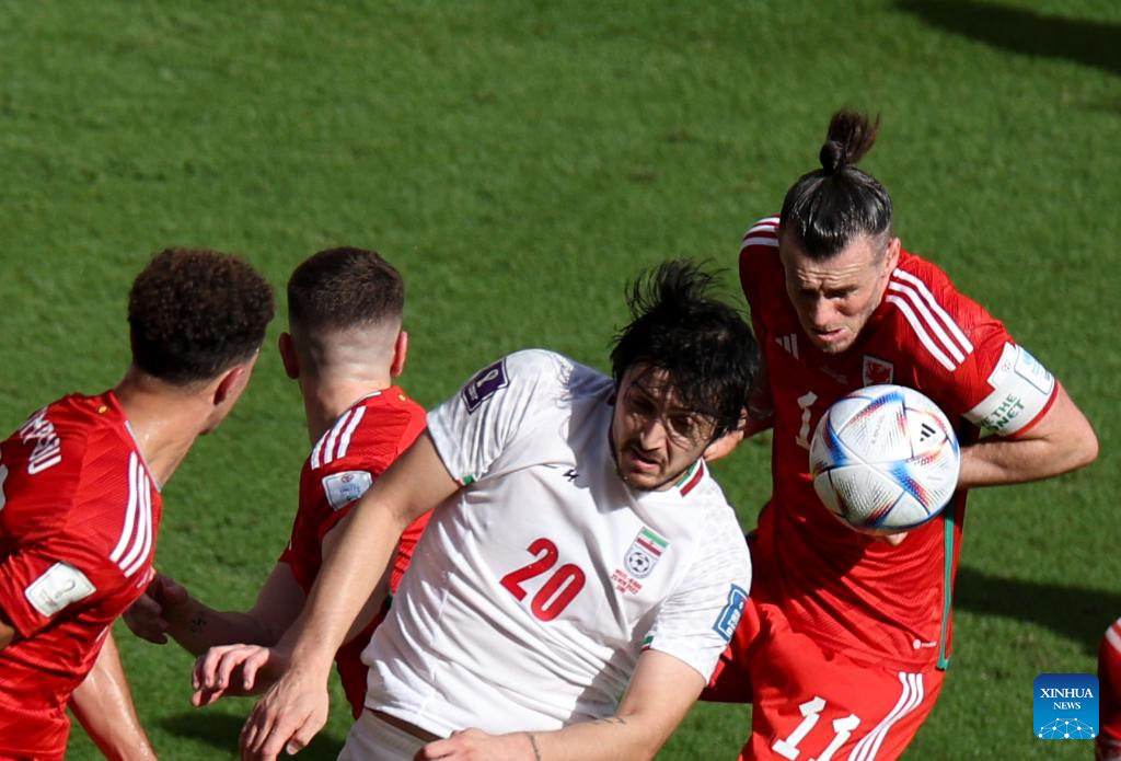 Sardar Azmoun (2nd R) of Iran vies for a header with Gareth Bale (1st R) of Wales during the Group B match between Wales and Iran at the 2022 FIFA World Cup at Ahmad Bin Ali Stadium in Al Rayyan, Qatar, Nov. 25, 2022. (Xinhua/Jia Haocheng)