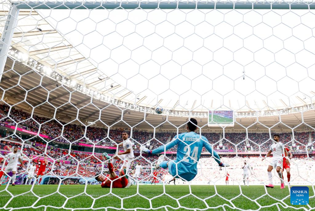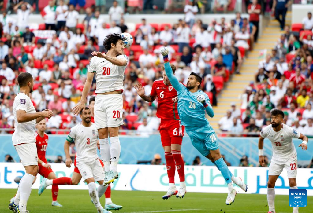 Hossein Hosseini (3rd R), goalkeeper of Iran, makes a save during the Group B match between Wales and Iran at the 2022 FIFA World Cup at Ahmad Bin Ali Stadium in Al Rayyan, Qatar, Nov. 25, 2022. (Xinhua/Wang Lili)