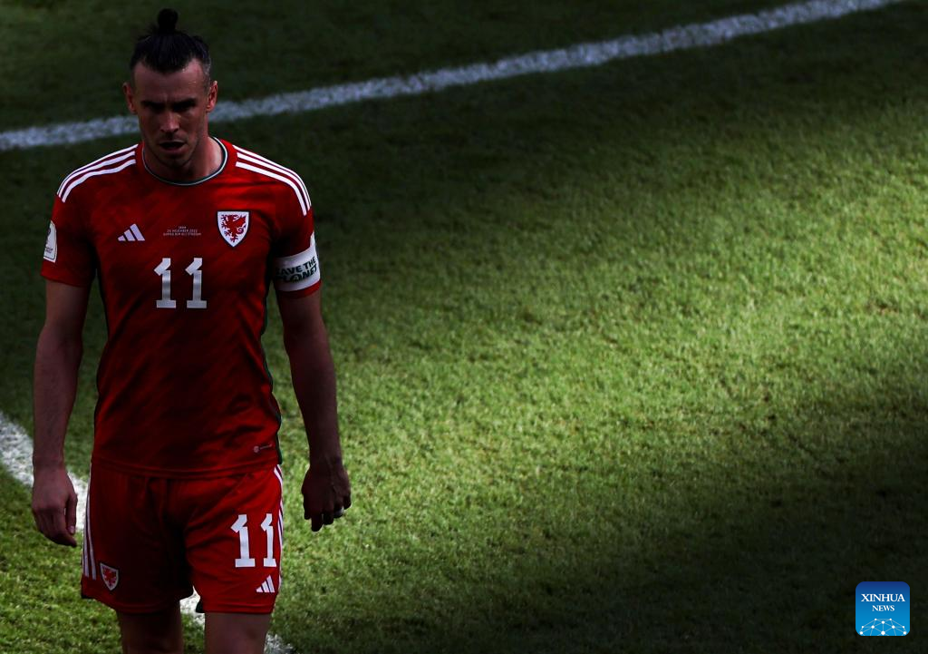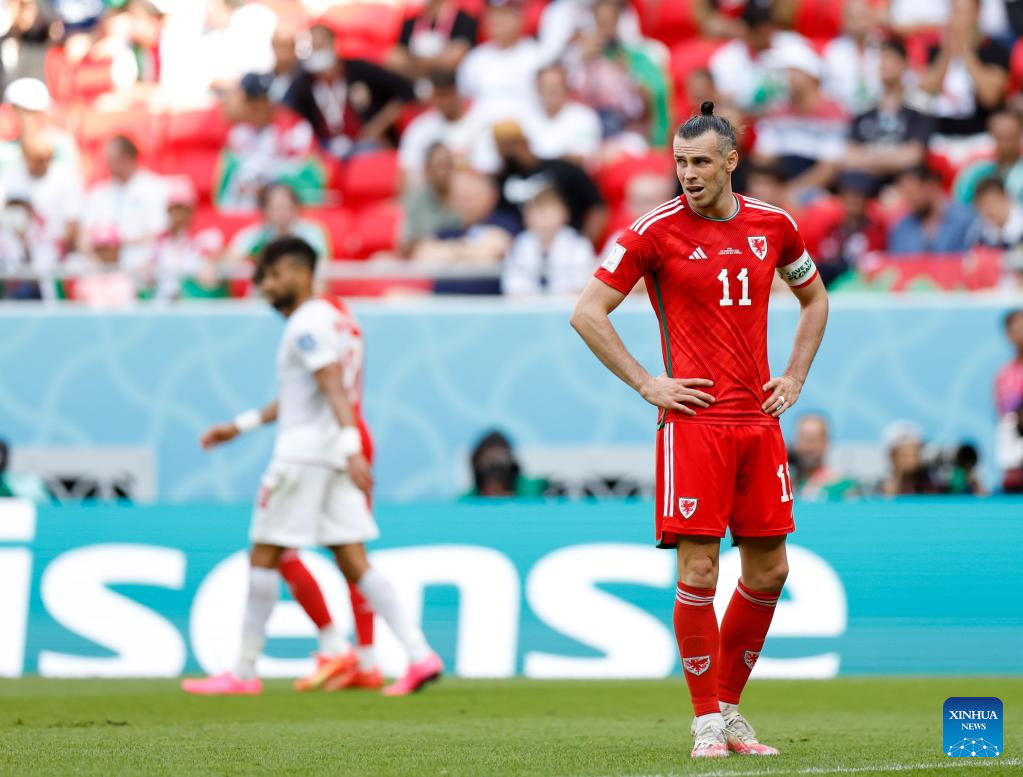 Gareth Bale of Wales reacts before the Group B match between Wales and Iran at the 2022 FIFA World Cup at Ahmad Bin Ali Stadium in Al Rayyan, Qatar, Nov. 25, 2022. (Xinhua/Meng Dingbo)