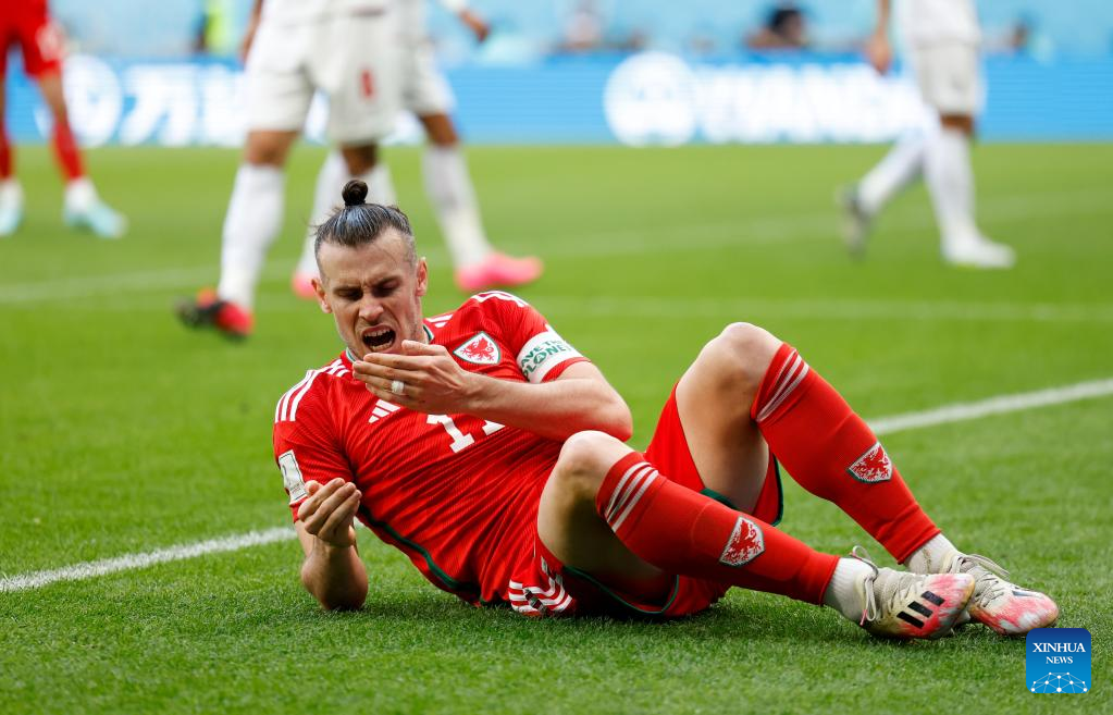 Gareth Bale of Wales reacts during the Group B match between Wales and Iran at the 2022 FIFA World Cup at Ahmad Bin Ali Stadium in Al Rayyan, Qatar, Nov. 25, 2022. (Xinhua/Wang Lili)