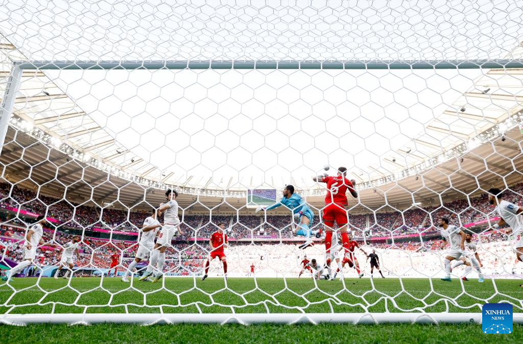 Sardar Azmoun (top) of Iran vies for a header during the Group B match between Wales and Iran at the 2022 FIFA World Cup at Ahmad Bin Ali Stadium in Al Rayyan, Qatar, Nov. 25, 2022. (Xinhua/Wang Lili)
