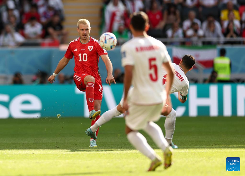 Aaron Ramsey (L) of Wales vies with Ehsan Hajisafi (R) of Iran during the Group B match between Wales and Iran at the 2022 FIFA World Cup at Ahmad Bin Ali Stadium in Al Rayyan, Qatar, Nov. 25, 2022. (Xinhua/Xu Zijian)