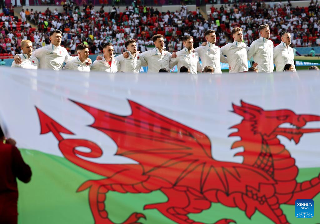 Players of Wales react before the Group B match between Wales and Iran at the 2022 FIFA World Cup at Ahmad Bin Ali Stadium in Al Rayyan, Qatar, Nov. 25, 2022. (Xinhua/Xu Zijian)