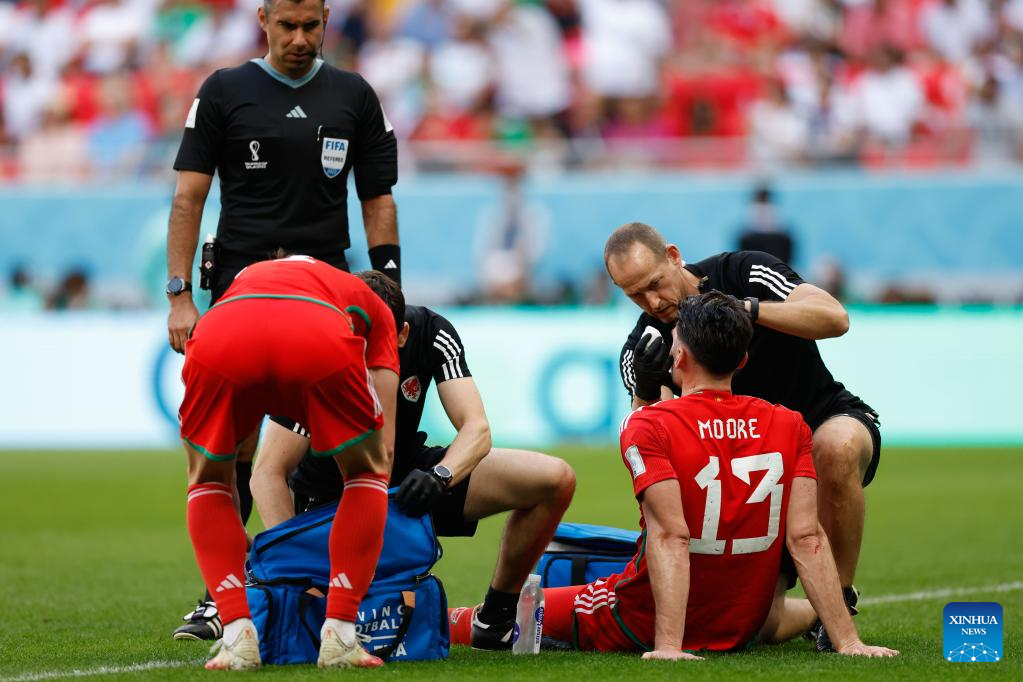 Kieffer Moore (bottom R) of Wales receives medical aid during the Group B match between Wales and Iran at the 2022 FIFA World Cup at Ahmad Bin Ali Stadium in Al Rayyan, Qatar, Nov. 25, 2022. (Xinhua/Wang Lili)
