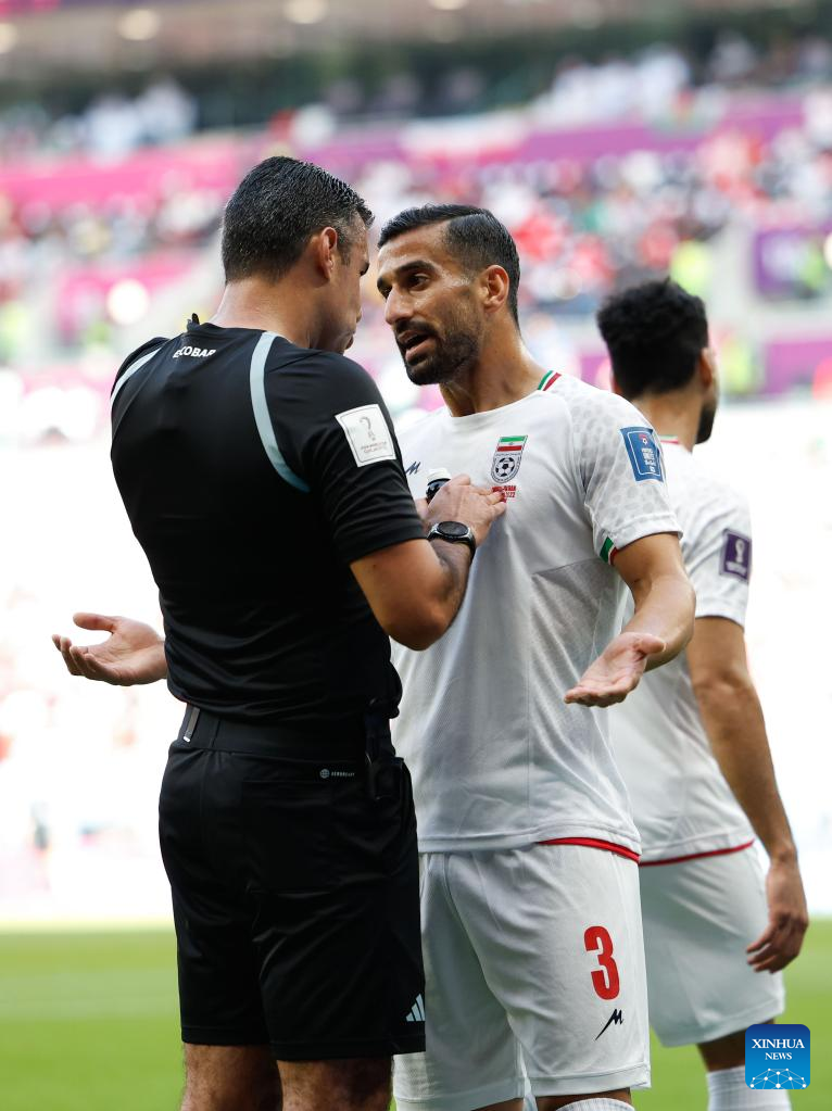 Referee Mario Escobar (L) communicates with Ehsan Hajisafi of Iran during the Group B match between Wales and Iran at the 2022 FIFA World Cup at Ahmad Bin Ali Stadium in Al Rayyan, Qatar, Nov. 25, 2022. (Xinhua/Wang Lili)